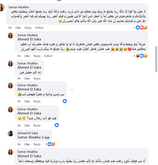 وقالت سمر السقا: "أنا بس خوفت تكون زعلت مني عشان سألتك إيه إللي حصل ربنا يخليك يارب ويبارك فيك ويحفظك ويسعدك دايمًا يارب يا أطيب وأحن قلب في الدنيا ويديك على قد نيتك الطيبة وقلبك الطيب".