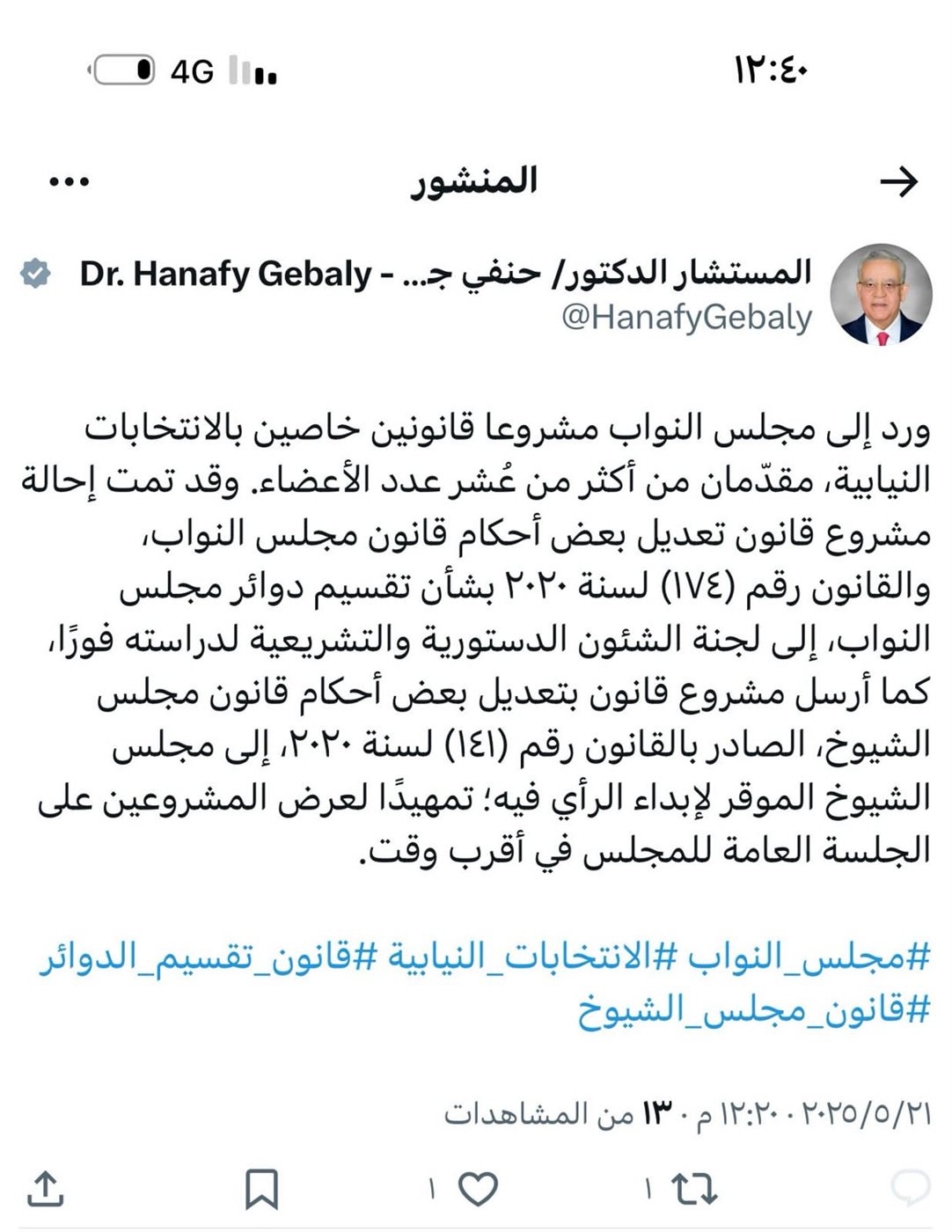 وأشار إلى أنه تمت إحالة مشروع قانون تعديل بعض أحكام قانون مجلس النواب، والقانون رقم (١٧٤) لسنة ٢٠٢٠ بشأن تقسيم دوائر مجلس النواب، إلى لجنة الشئون الدستورية والتشريعية لدراسته فورًا.