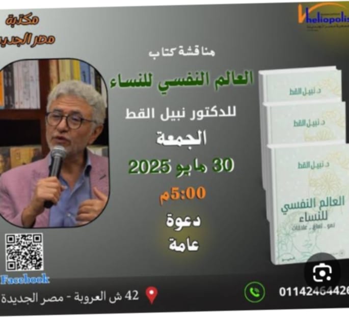 تنظم مكتبة مصر الجديدة العامة في الساعة الخامسة من مساء يوم الجمعة القادم حفل توقيع وماقشة كتاب "العالم النفسي للنساء (نمو.. تعافي.. علاقات)" للدكتور نبيل القط والذى يهدف إلى تمكين النساء من فهم أنفسهن بشكل أفضل وإدارة حياتهن بشكل أكثر كفاءة الكتاب يستعرض ويحلل صراعات المرأة النفسية والاجتماعية، مع التركيز على أهمية الرفاهية النفسية.