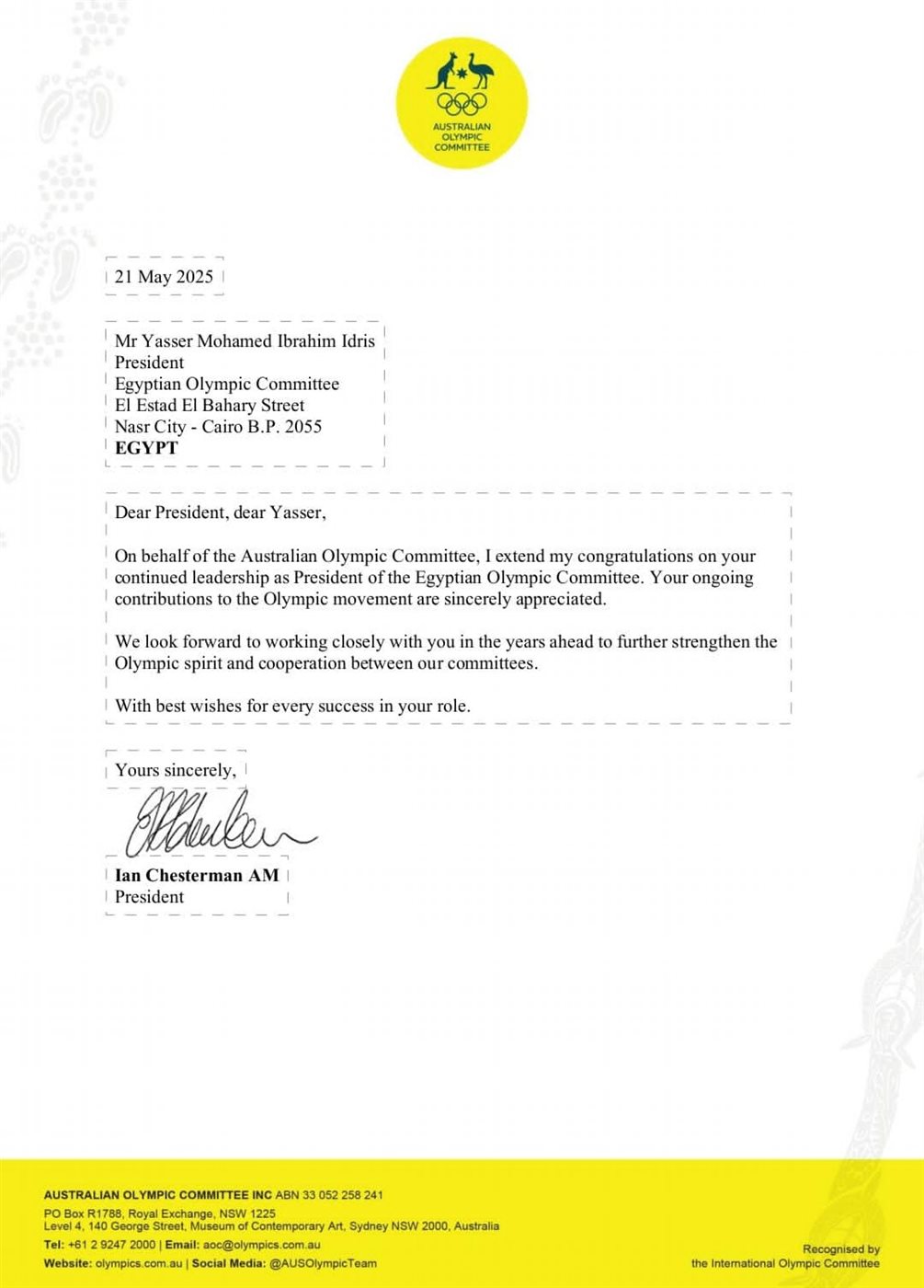 وجاء في الخطاب: "بالنيابة عن اللجنة الأولمبية الأسترالية، أتقدم بأحر التهاني على استمرار قيادتكم كرئيس للجنة الأولمبية المصرية، ونقدر عاليًا مساهماتكم المتواصلة في الحركة الأولمبية".