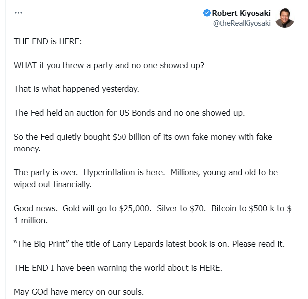 وقال روبرت كيوساكي عن نهاية أمريكا: "النهاية هنا: ماذا لو قمت بإقامة حفلة ولم يحضر أحد؟ وهذا ما حدث بالأمس، أقام بنك الاحتياطي الفيدرالي مزادًا للسندات الأمريكية ولم يحضر أحد، لذا اشترى بنك الاحتياطي الفيدرالي بهدوء 50 مليار دولار من أمواله المزيفة بأموال مزيفة، انتهى الحفل. التضخم الجامح قادم. ملايين، صغارًا وكبارًا، سيُبادون ماليًا".