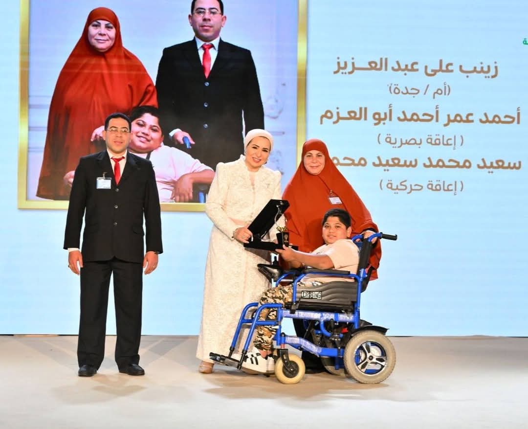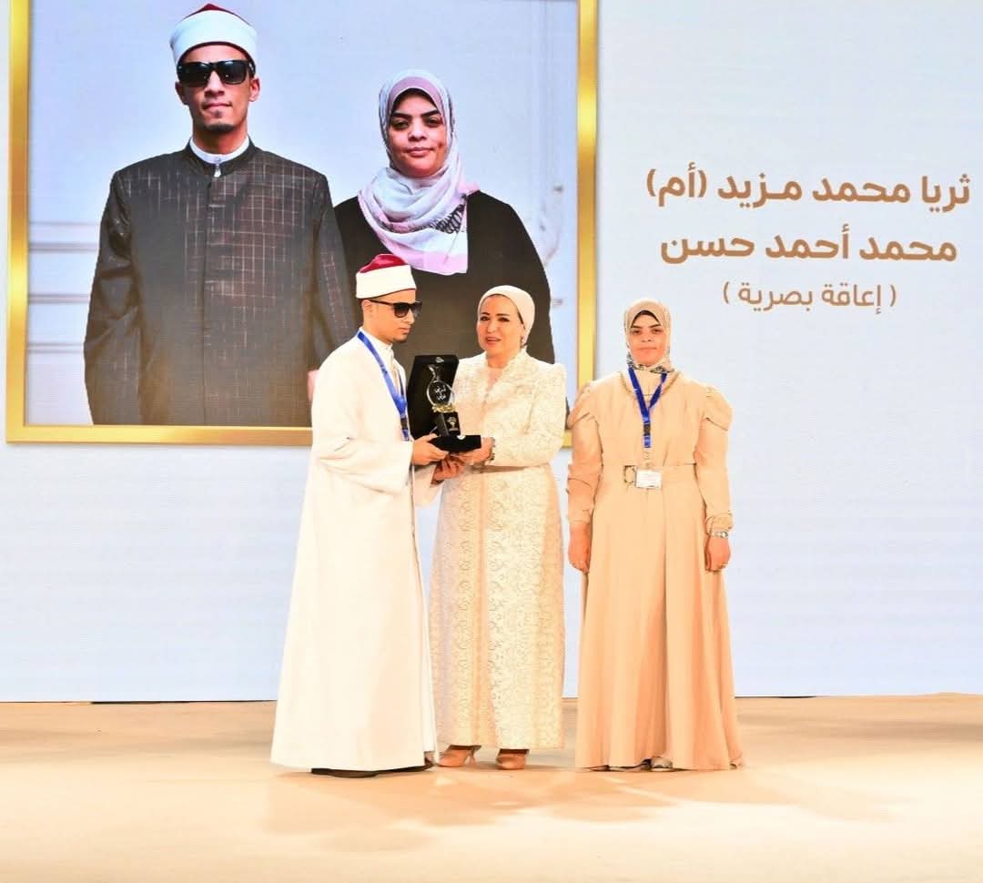 وخلال الاحتفالية، قامت السيدة انتصار السيسي بتكريم الطالب الأزهري صاحب البصيرة ووالدته، تقديرًا لتفوقه وإصراره رغم التحديات، مما يعكس دعم الأسرة القوي له.
