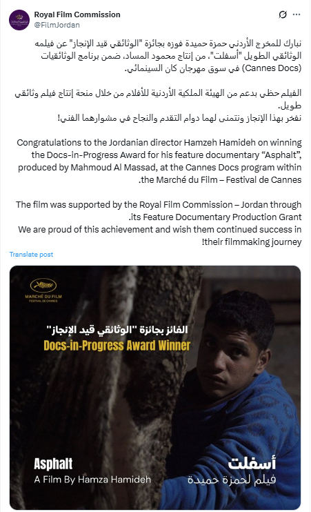 فاز المخرج الأردني حمزة حميدة بجائزة "الوثائقي قيد الإنجاز" عن فيلمه الوثائقي الطويل "أسفلت"، وذلك ضمن برنامج Cannes Docs في سوق مهرجان كان السينمائي الدولي، في إنجاز جديد يسلط الضوء على الحضور المتنامي للسينما الأردنية في المحافل العالمية.