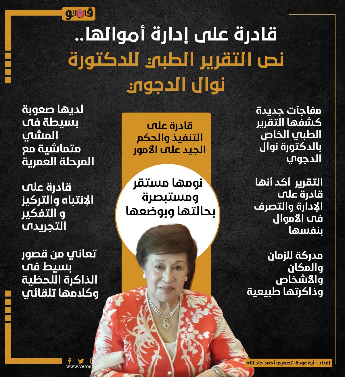 قادرة على إدارة أموالها.. التقرير الطبي للدكتورة نوال الدجوي في قضية الحجر (إنفوجراف)