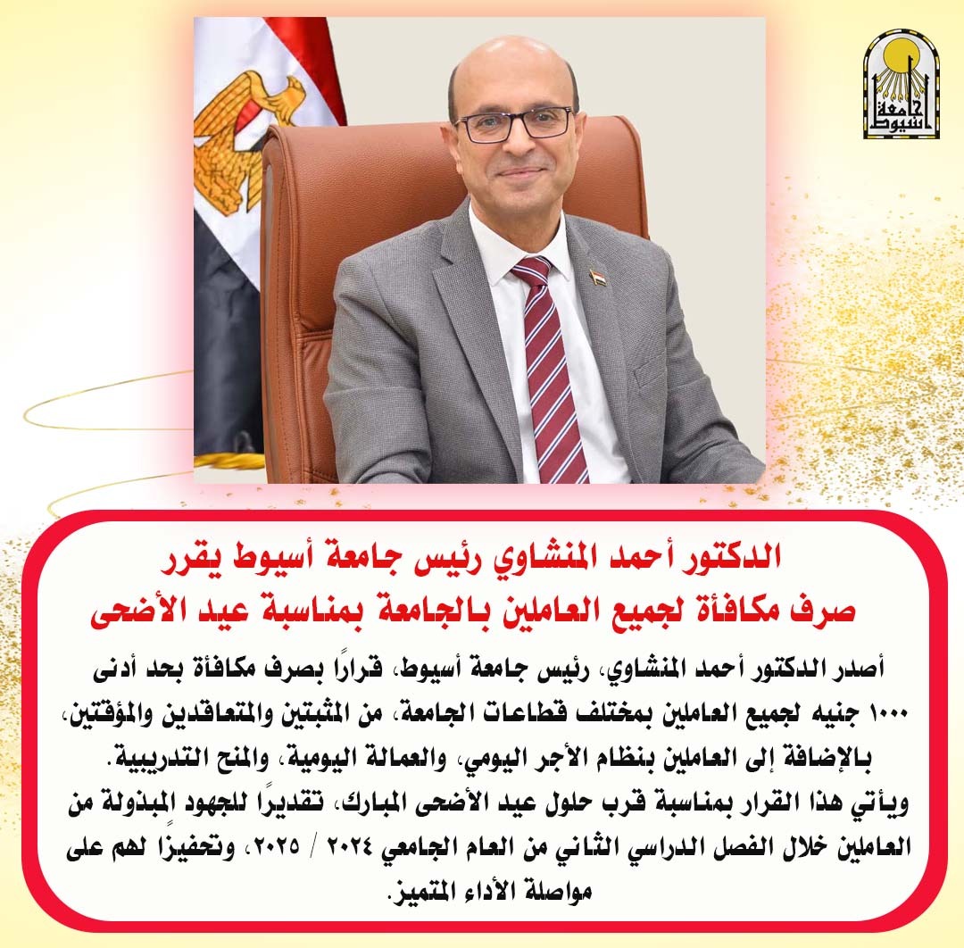 قرر الدكتور أحمد المنشاوي، رئيس جامعة أسيوط، صرف مكافأة للعاملين بكافة قطاعات الجامعة، تشمل المثبتين، والمتعاقدين، والمؤقتين، والعاملين بنظام الأجر اليومي، والعمالة اليومية، والمنح التدريبية، وذلك بحد أدنى قدره (1000) جنيه.