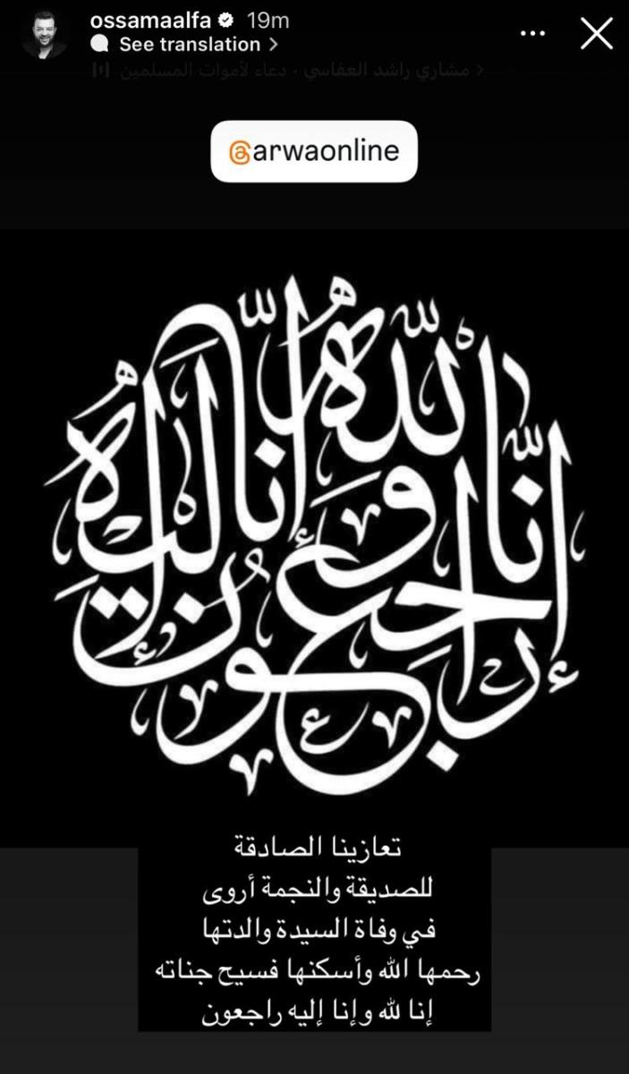 وقالت إحدى صديقات أروى على صفحتها على موقع التواصل الاجتماعي: “إنا لله وإنا إليه راجعون، عظم الله أجركم، وأحسن عزاءكم، وغفر لميتكم نسأل الله أن يرحمها ويغفر لها، وأن يلهم أهله الصبر والسلوان، عظم الله أجركم، وأحسن عزائكم، وجبر مصابكم، وغفر لميتكم.. تعازينا للفنانة أروى”.