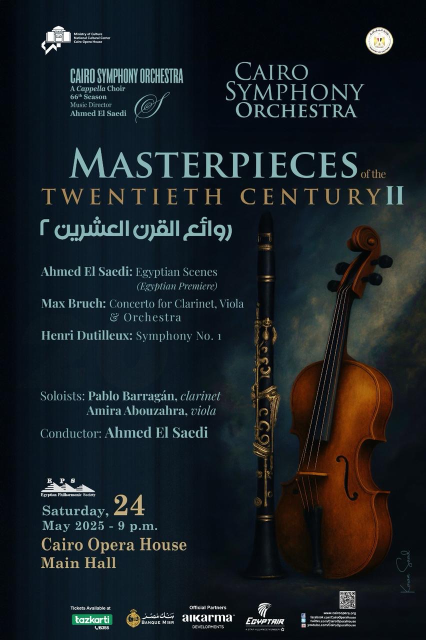 الحفل من سلسلة روائع القرن العشرين ويضم نخبة من الأعمال الكلاسيكية التى وضعها كبار المؤلفين منها كونشيرتو الكلارينيت والفيولا والأوركسترا لـ بروخ، السيمفونية الأولى لـ هنرى دوتيو ومشاهد مصرية تعزف لأول مرة فى مصر لقائد الحفل المايسترو أحمد الصعيدى.