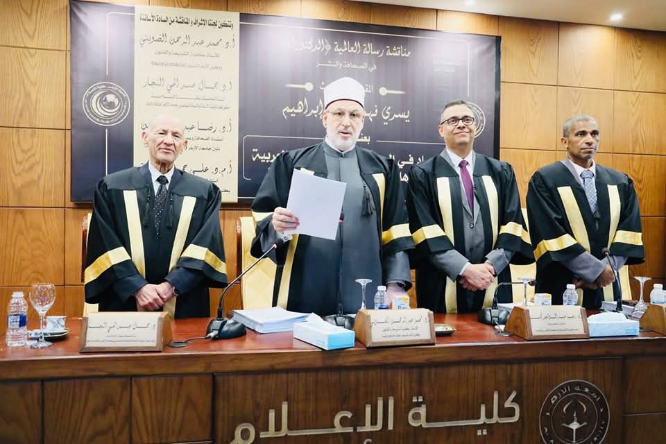 وقد حصل الباحث بعد مناقشة علنية على درجة الدكتوراه في الإعلام- تخصص الصحافة والنشر- بتقدير مرتبة الشرف الأولى مع التوصية بالطبع والتبادل مع المؤسسات العلمية والأكاديمية.