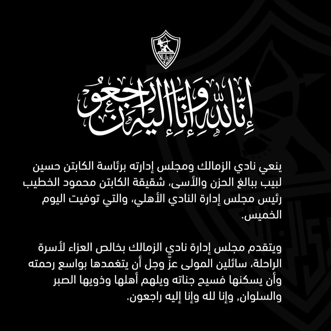 نعى مجلس إدارة نادي الزمالك برئاسة حسين لبيب، محمود الخطيب رئيس النادي الأهلي في وفاة شقيقته.