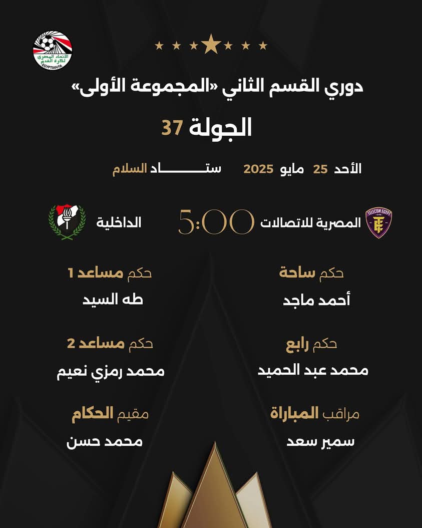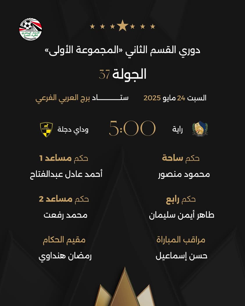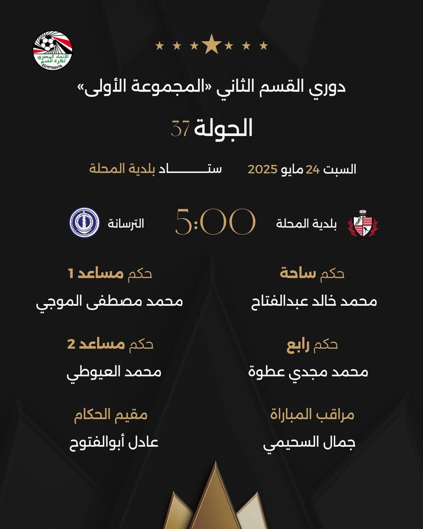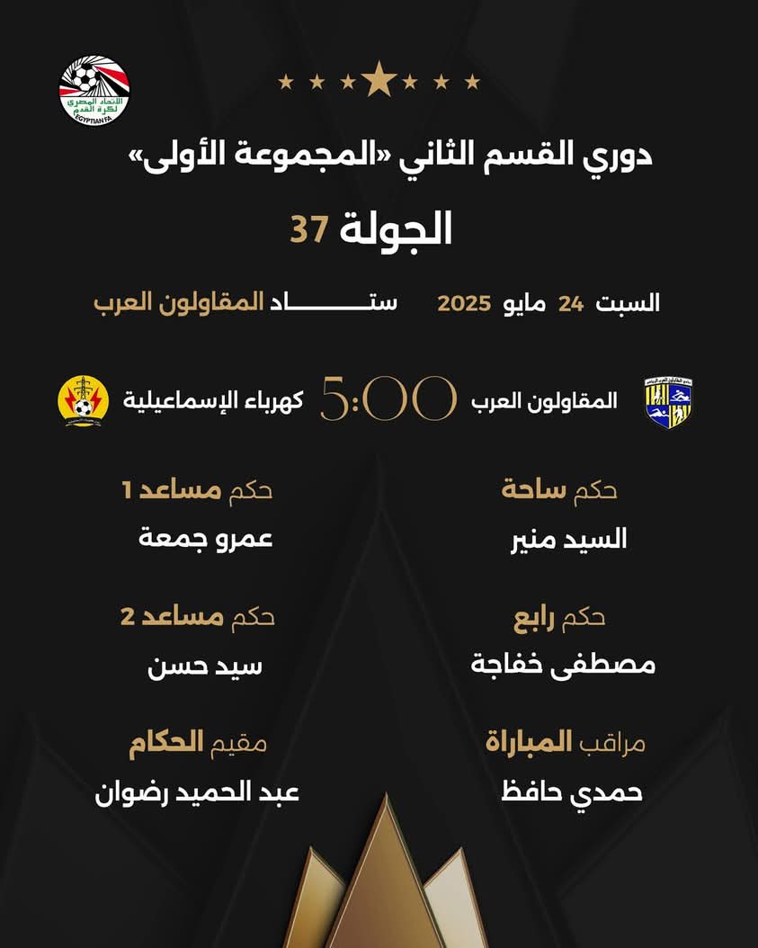 دوري المحترفين، أعلن اتحاد الكرة، حكام مباريات الجولة الـ37 وقبل الأخيرة لمسابقة دوري المحترفين موسم 2024-2025.