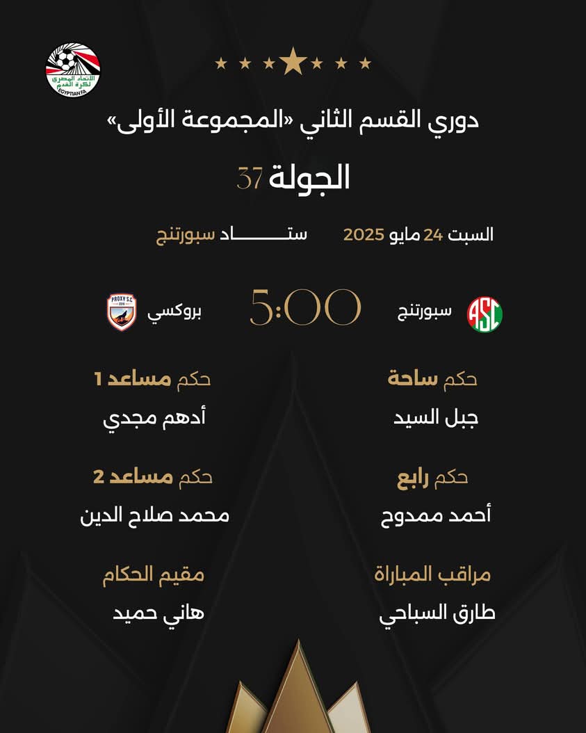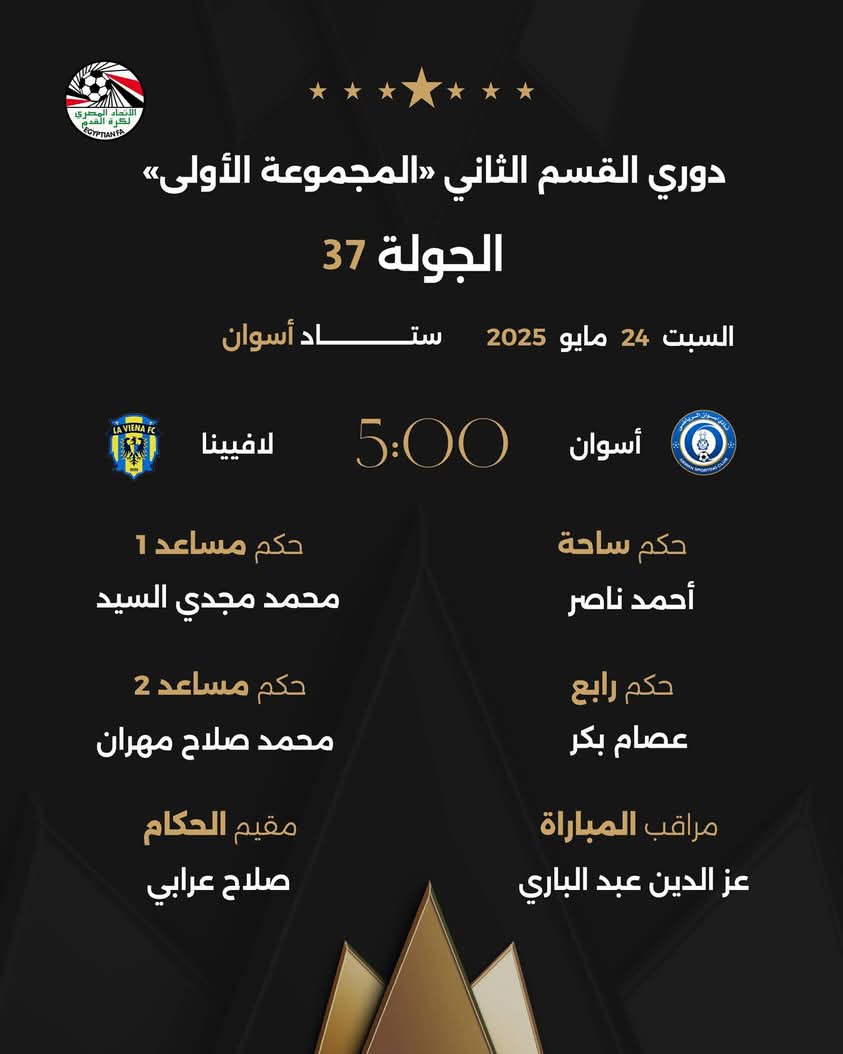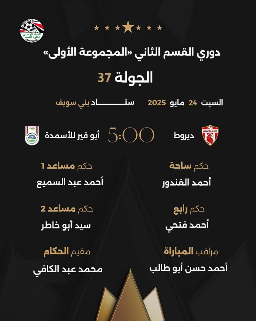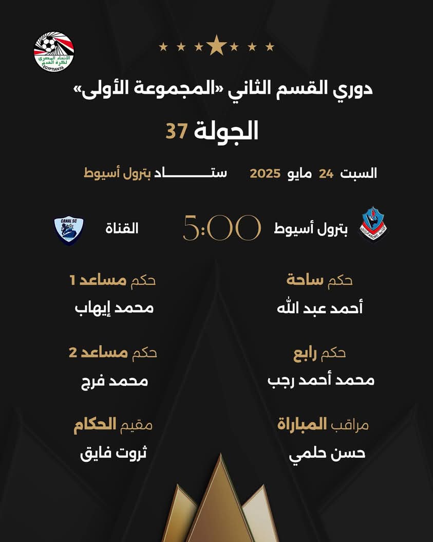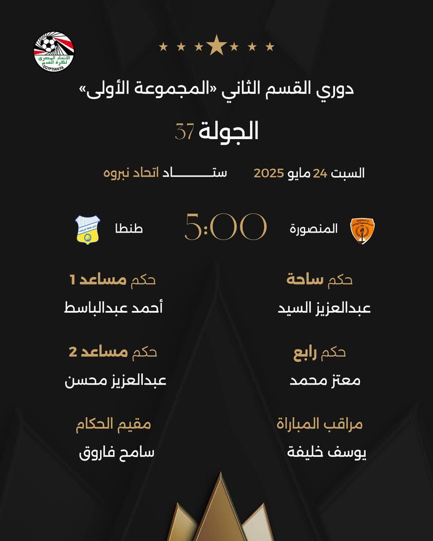 دوري المحترفين، أعلن اتحاد الكرة، حكام مباريات الجولة الـ37 وقبل الأخيرة لمسابقة دوري المحترفين موسم 2024-2025.
