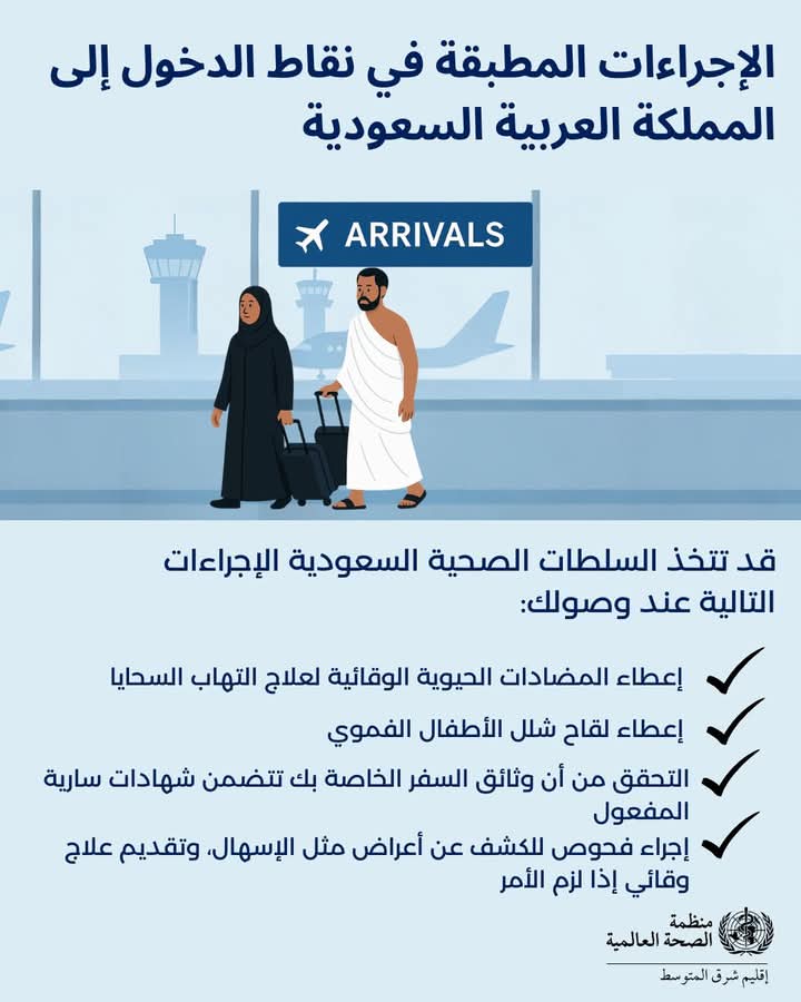 كشفت منظمة الصحة العالمية عن وجود مجموعة من الإجراءات التي تطبقها المملكة العربية السعودية في نقاط الدخول إلى المملكة العربية السعودية للمساعدة في حماية صحة الحجاج في موسم الحج 2025.