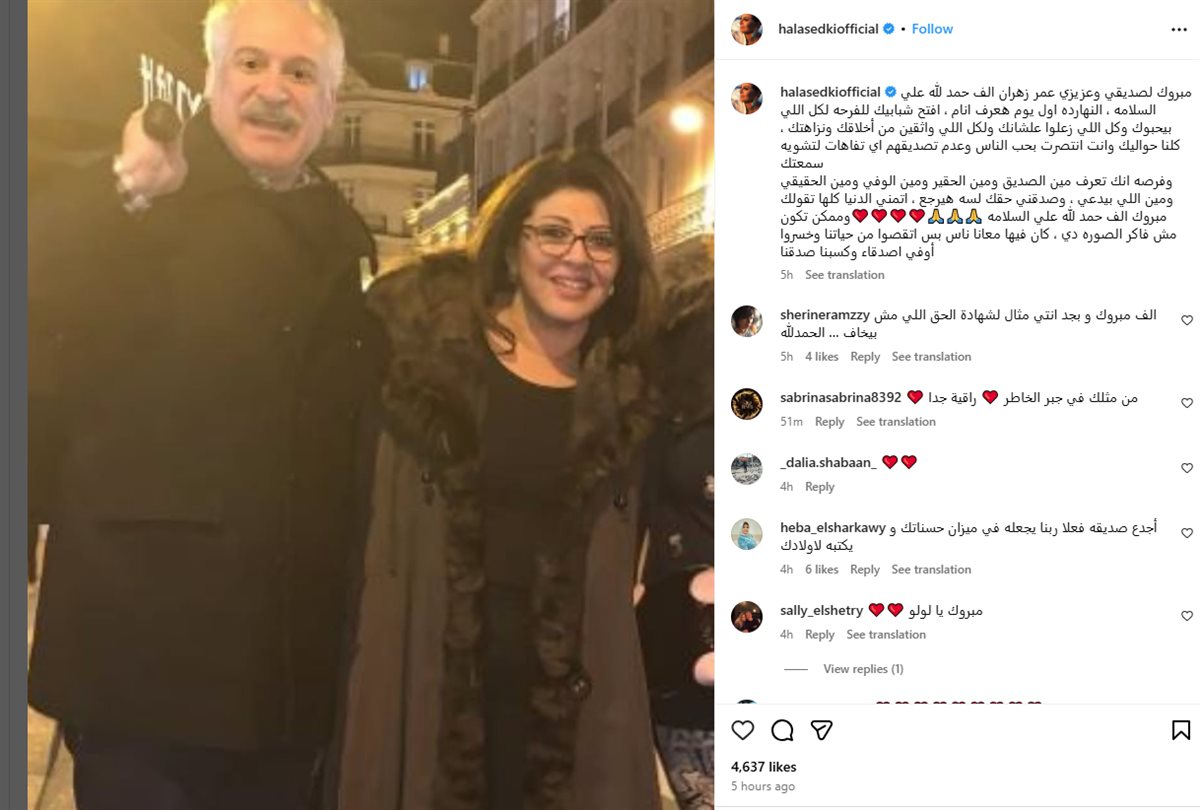 نشرت الفنانة هالة صدقي عبر حسابها الرسمي على "إنستجرام" صورة تجمعها بالمخرج عمر زهران، معلقة: مبروك لصديقي وعزيزي عمر زهران، ألف حمد الله على السلامة، النهارده أول يوم هعرف أنام.