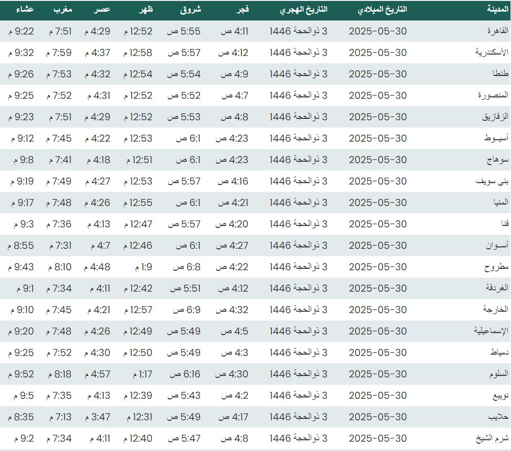 مواقيت الصلاة اليوم الجمعة 30 – 5 - 2025 في القاهرة والمحافظات