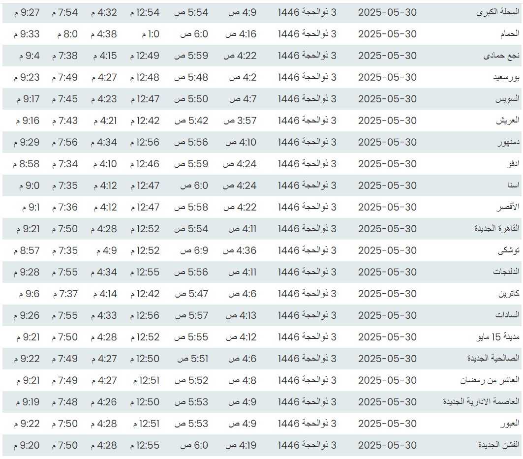 مواقيت الصلاة اليوم وفقًا للتوقيت المحلي لمدينتي القاهرة والإسكندرية وكذلك لعدد من مدن ومحافظات الجمهورية من واقع بيانات الهيئة العامة للمساحة: