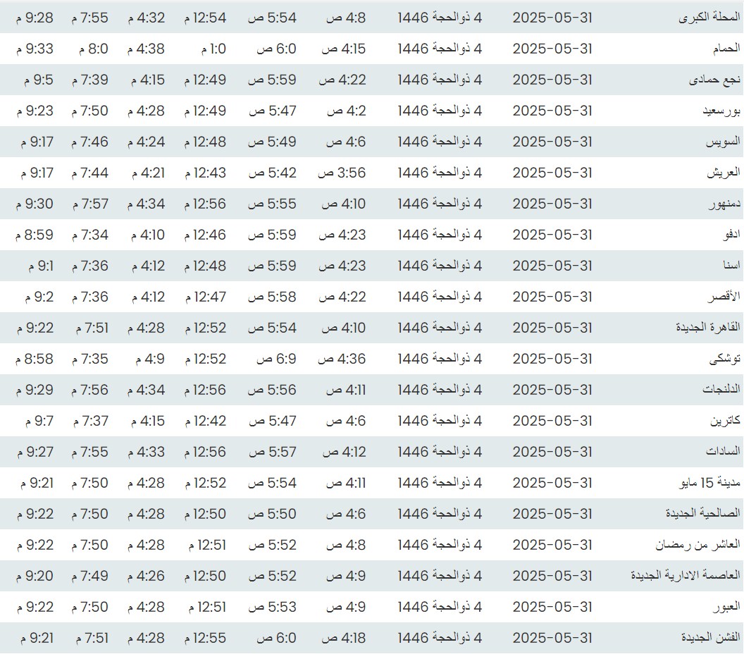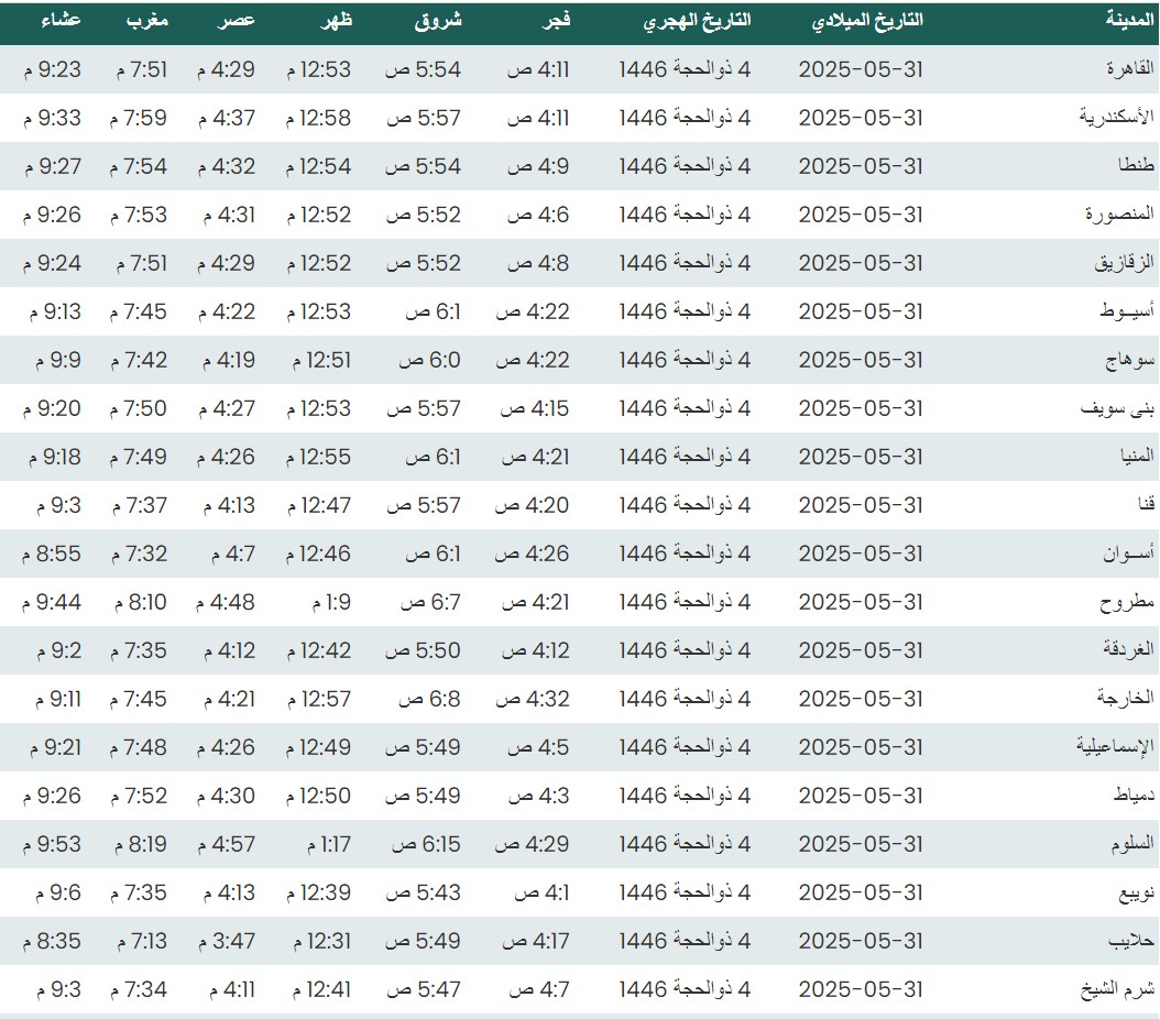 وفيما يلي مواقيت الصلاة، لعدد من مدن ومحافظات الجمهورية من واقع بيانات الهيئة العامة للمساحة