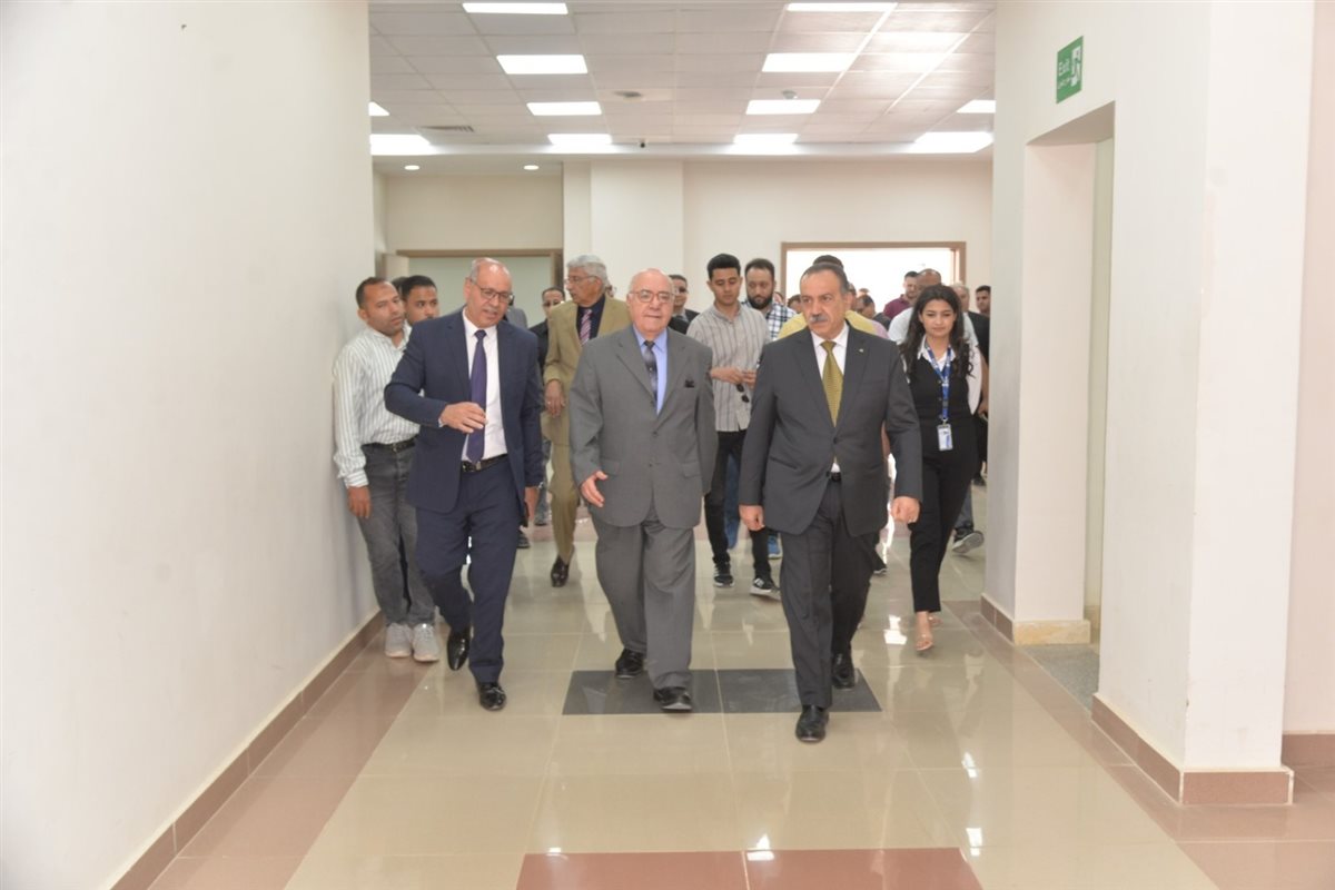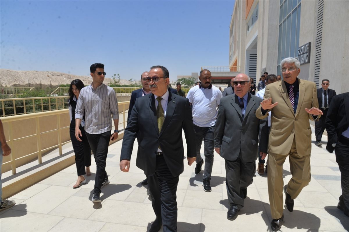 وكان في استقباله الدكتور مصطفى كمال، رئيس الجامعة، بحضور عدد من القيادات الأكاديمية والتنفيذية، من بينهم الدكتور عصام زناتي، نائب رئيس الجامعة لشئون التعليم والطلاب، والمهندس محمود عمر، أمين عام الجامعة، والمهندسة جيهان عمار، رئيس جهاز مدينة ناصر، وإيهاب عبدالحميد، رئيس فرع جهاز تنمية المشروعات الصغيرة والمتوسطة والمتناهية الصغر، وداليا تادرس، مدير فرع هيئة تنمية الصعيد، وعدد من عمداء الكليات وأعضاء هيئة التدريس بالجامعة.