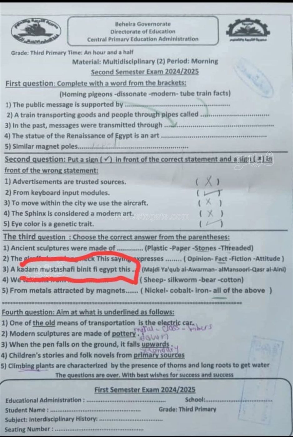 حالة من الجدل أثيرت عبر مواقع التواصل الاجتماعي المختلفة بسبب امتحان مادة اللغة الانجليزية لطلاب الصف الثالث الابتدائي للفصل الدراسي الثاني بمحافظة البحيرة.