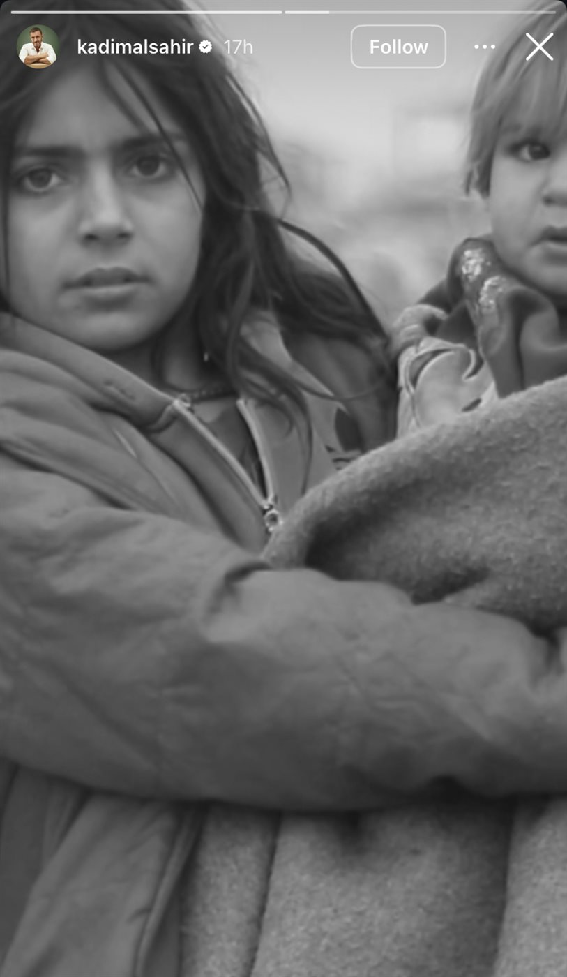 كما نشر أيضا صورة مؤثرة لطفل يقف وسط الركام، وأرفقها بموال للشاعر العراقي عبد الرزاق عبد الواحد، والذي تقول كلماته: "كثرُ السكوتِ على كثرة الأذى سقمٌ، قد يَسكت الجرح لكن ينطقُ الألمُ. وإن للصبر حدًا عند صاحبه، قد يسكت العقل لكن تصرخُ القيمُ".