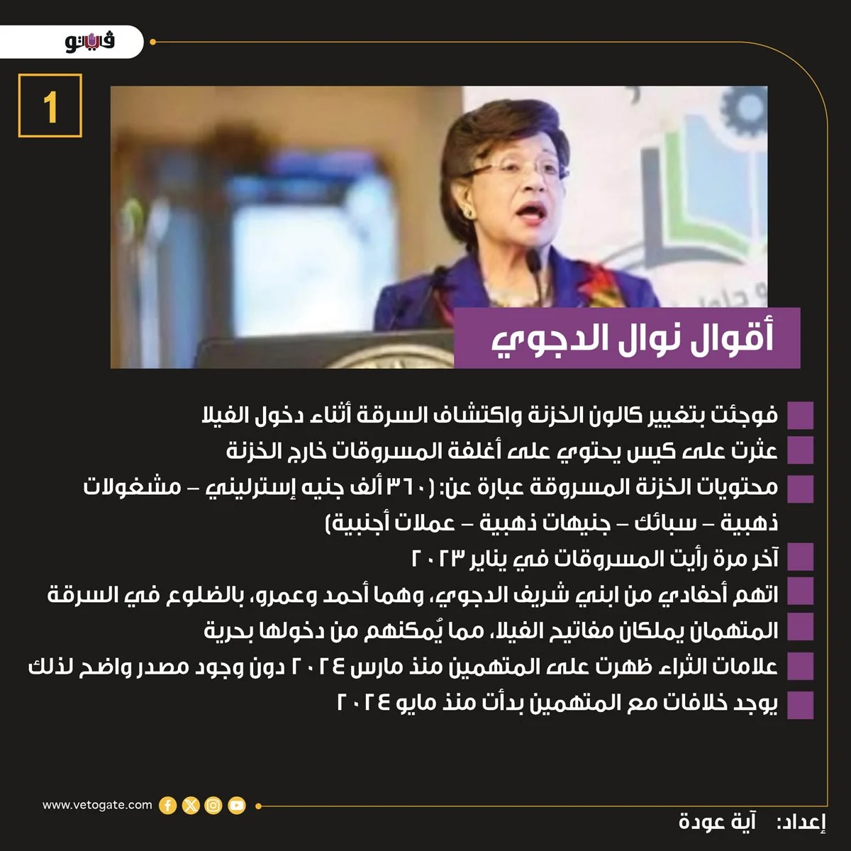 البداية كانت يوم الاثنين 19 مايو 2025.. فى هذا اليوم تقدمت الدكتورة نوال الدجوي صاحبة جامعة مصر للعلوم الحديثة والآداب، ببلاغ إلى قسم أول اكتوبر، قالت فيه إنها اكتشفت سرقة مبالغ مالية كبيرة ومشغولات ذهبية من مسكنها بمدينة 6 اكتوبر.