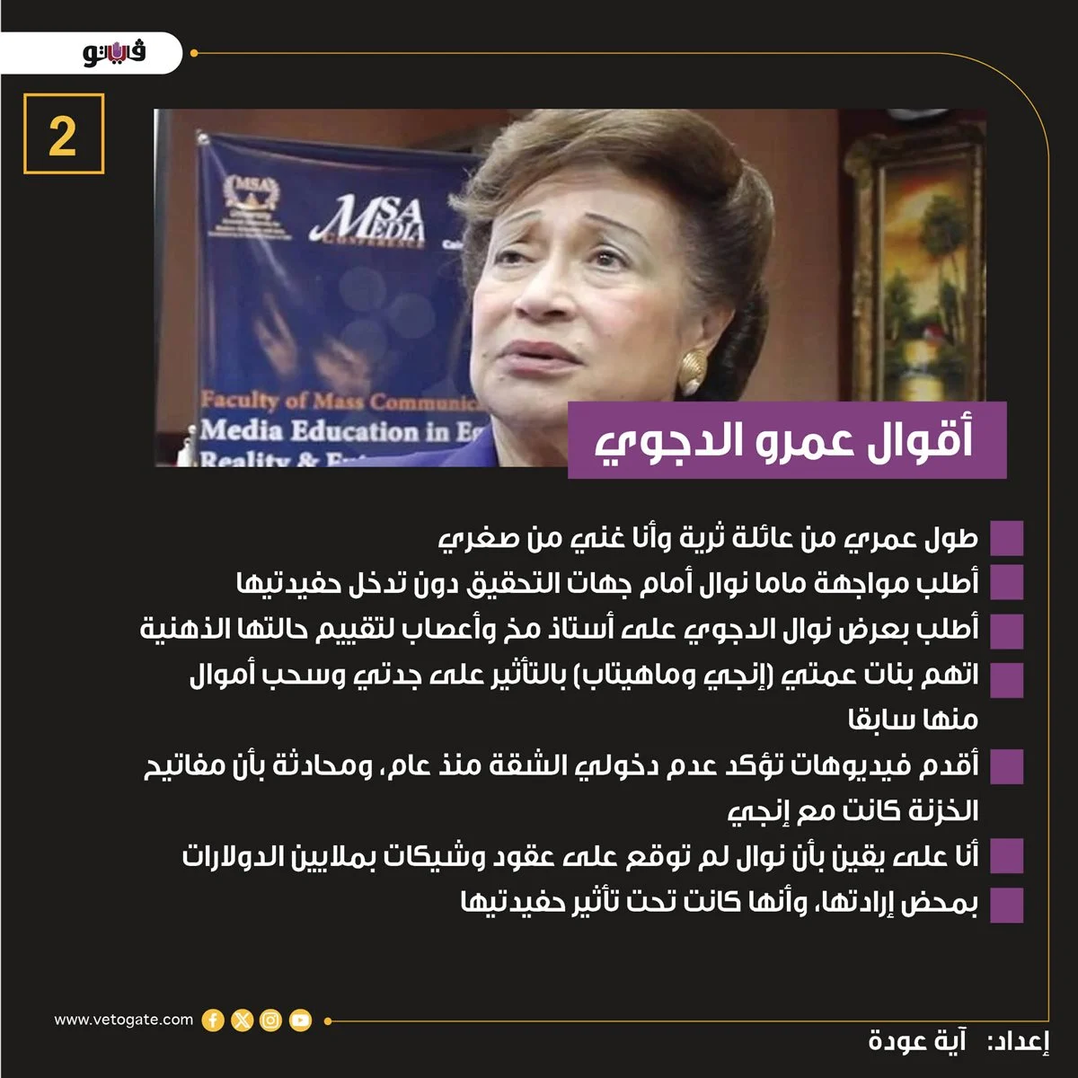 ثم فجر مفاجأة من العيار الثقيل بتأكيده على أن الدكتورة نوال الدجوي لا تدير أملاكها وغير قادرة على اتخاذ أى قرارات صائبة بشأن تلك الممتلكات، وأن حفيدتيها من ابنتها الراحل «منى»، هما المتحكمتان فى كل شيء.. وأشار المحامي إلى أنه يجرى الإعداد لإقامة دعوى حجر ضد الجدة، وبعد ظهر ذات اليوم تم تداول تقرير طبي يحمل اسم «نوال» ويشير إلى معاناتها من ضمور فى المخ ومشاكل ذهنية، وهو التقرير الذى قال البعض إنه دليل الإثبات فى دعوى الحجر المزمع إقامتها.