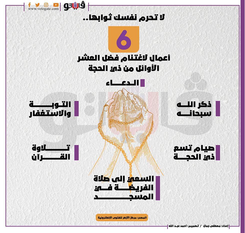 وأوضحت اللجنة أن الْعَشر الأُوَل من ذي الحجة أيام مباركات، لها فضل عظيم، ففيها تَكْثُرُ الخيرات، وتتضاعف الحسنات، ويستحب فيها الإكثار من الطاعات، أقسم ربنا بها في كتابه؛ وذلك لعظم شأنها، وتنويهًا لفضلها؛ لأنه لا يقسم إلا بشيء عظيم، فقال -عَزَّ من قائل-: {وَالْفَجْرِ * وَلَيَالٍ عَشْرٍ} [الفجر: 1، 2]، رُوِيَ عَنِ سيدنا عبد الله بْنِ عَبَّاسٍ -رضي الله عنهما-: أَنَّهَا الْعَشْرُ الْأُوَلُ مِنْ ذِي الْحِجَّةِ. وَهُوَ قَوْل مُجَاهِد وَقَتَادَة وَالضَّحَّاك وَالسُّدِّيّ وَالْكَلْبِيّ. تفسير القرطبي (20/ 39).
