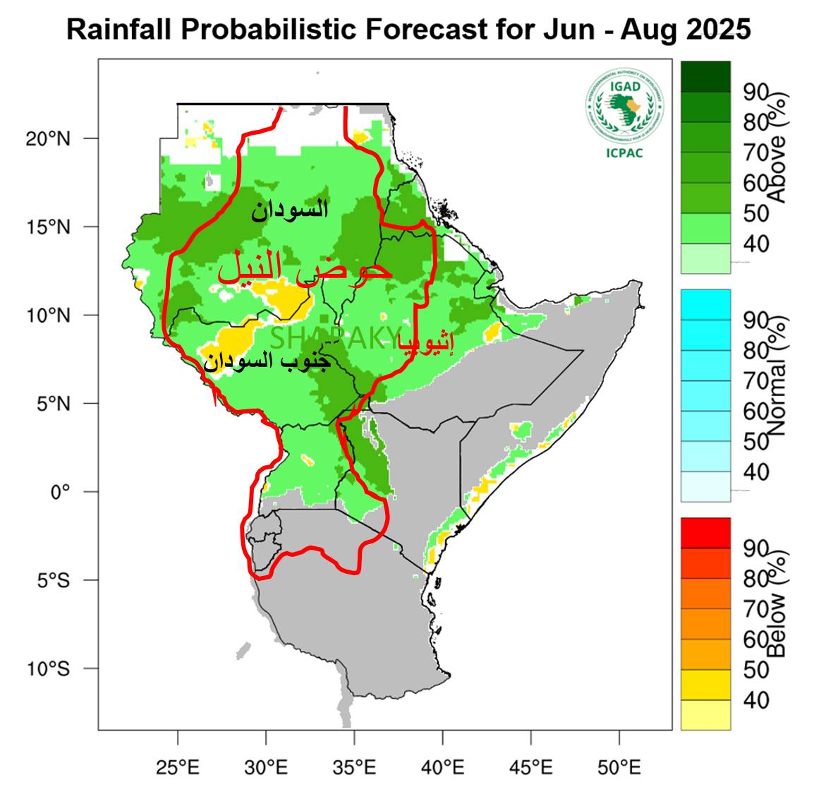 وأضاف أنه طبقا لمركز إيجاد IGAD للتنبؤات المناخية والتطبيقات لتوقعات الأمطار على الهضبة الإثيوبية التى تساهم بنحو 85% من إيراد نهر النيل خلال الثلاثة أشهر القادمة (يونيو - أغسطس)، من المتوقع أن تكون الأمطار خلال يونيو-أغسطس 2025 أعلى من المتوسط".