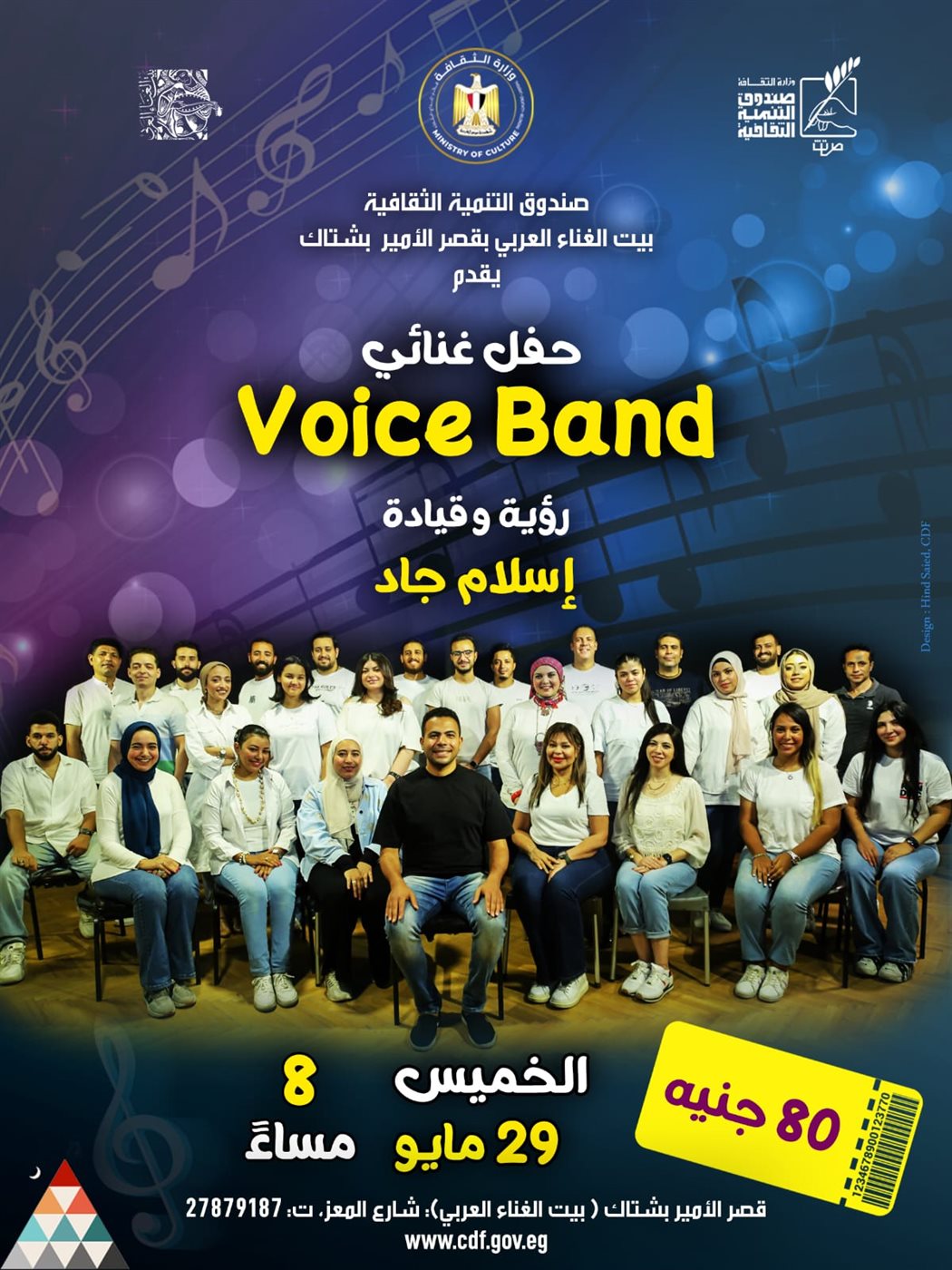يقيم قطاع صندوق التنمية الثقافية برئاسة المعماري حمدى السطوحى، يوم الخميس القادم الموافق 29 مايو حفلًا غنائيًا جديدًا لفرقة "فويس باند" وذلك بمركز إبداع قصر الأمير بشتاك (بيت الغناء العربى) بشارع المعز، بقيادة المايسترو إسلام جاد، في تمام الساعة الثامنة مساءً.