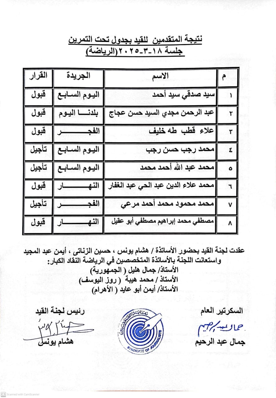 أعلنت لجنة القيد بنقابة الصحفيين، عن نتيجة لجنة المؤجلين الأخيرة التي عقدت في شهر مارس الماضي، بعد اعتمادها من مجلس النقابة مساء أمس الإثنين.
