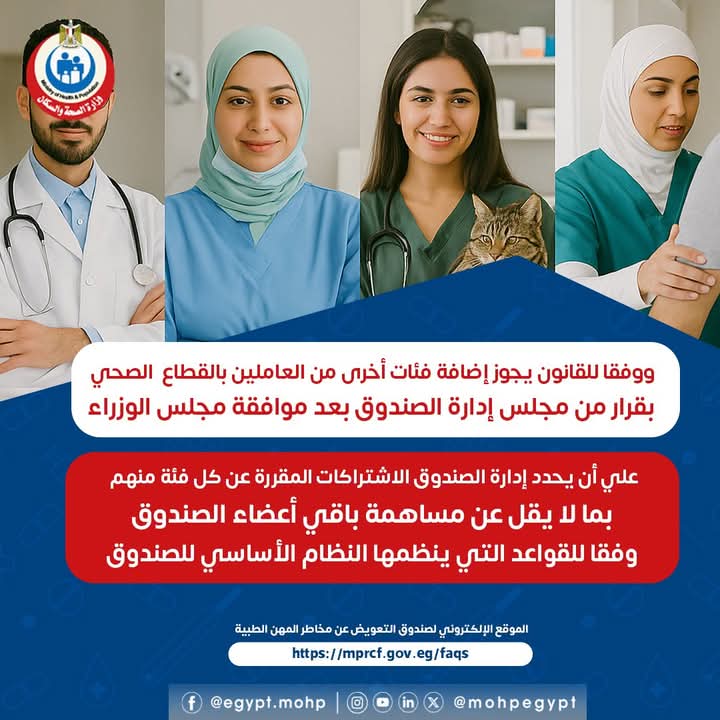 ووفقا للقانون، يجوز إضافة فئات أخرى من العاملين بالقطاع الصحي بقرار من مجلس إدارة الصندوق بعد موافقة مجلس الوزراء، على أن يحدد مجلس إدارة الصندوق الاشتراكات المقررة عن كل فئة منهم بما لا يقل عن مساهمة باقي أعضاء الصندوق وفقا للقواعد التي ينظمها النظام الأساسي للصندوق.