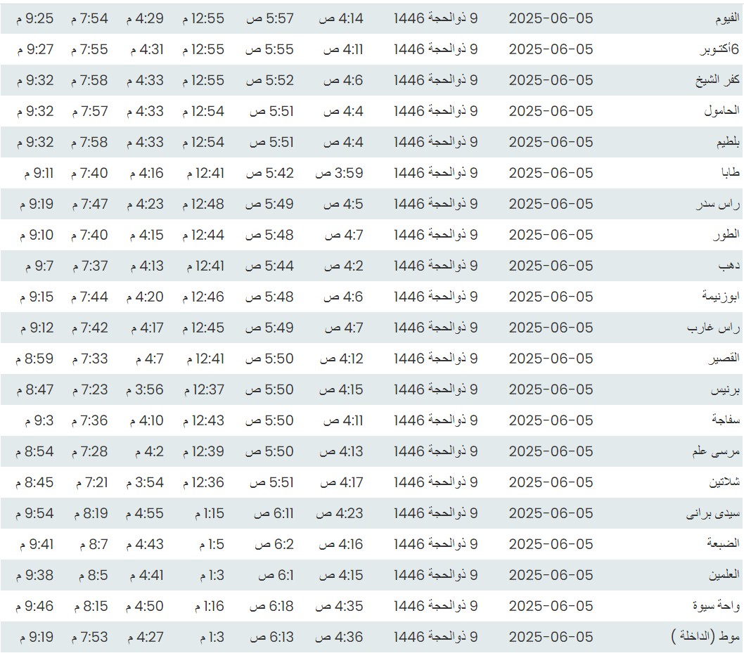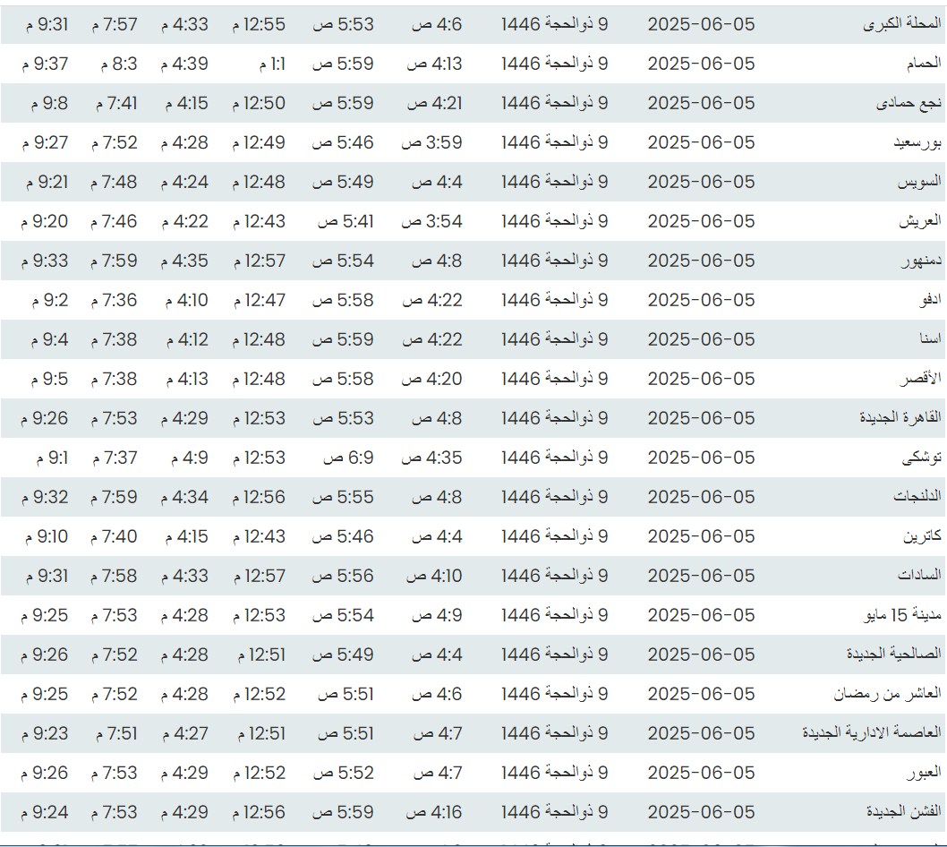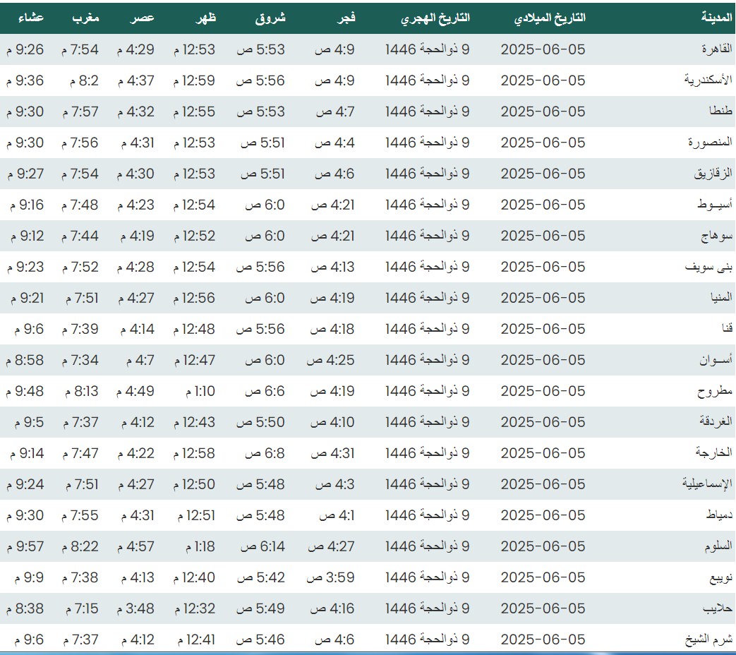 وفيما يلي مواقيت الصلاة، لعدد من مدن ومحافظات الجمهورية من واقع بيانات الهيئة العامة للمساحة