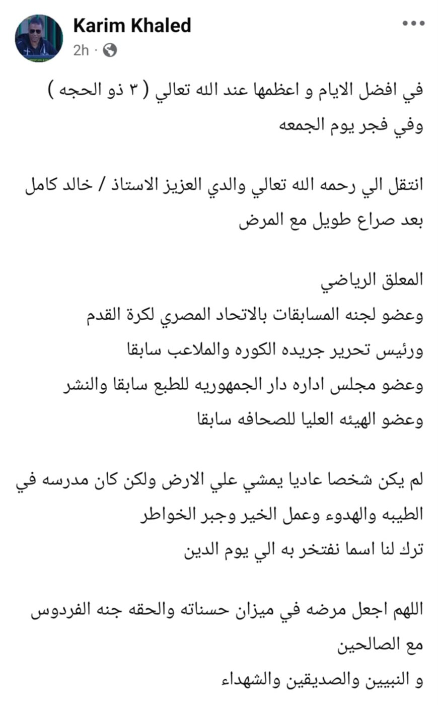 وأعلن نجله، كريم خالد وفاة والده عبر صفحته على فيس بوك.