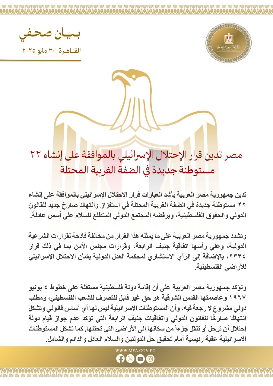 أدانت جمهورية مصر العربية بأشد العبارات قرار الاحتلال الإسرائيلي بالموافقة على إنشاء ٢٢ مستوطنة جديدة في الضفة الغربية المحتلة، في استفزاز وانتهاك صارخ جديد للقانون الدولي والحقوق الفلسطينية، ويرفضه المجتمع الدولي المتطلع للسلام على أسس عادلة.