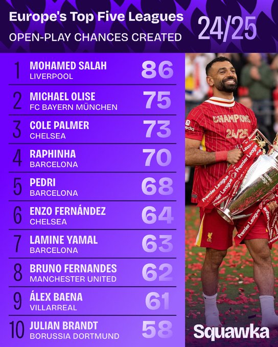 وتمكن محمد صلاح من صناعة 86 فرصة لزملائه في الفريق خلال الموسم الماضي وجاء بالمركز الثاني مايكل أولسيه لاعب بايرن ميونخ ثم كول بالمر لاعب تشيلسي.