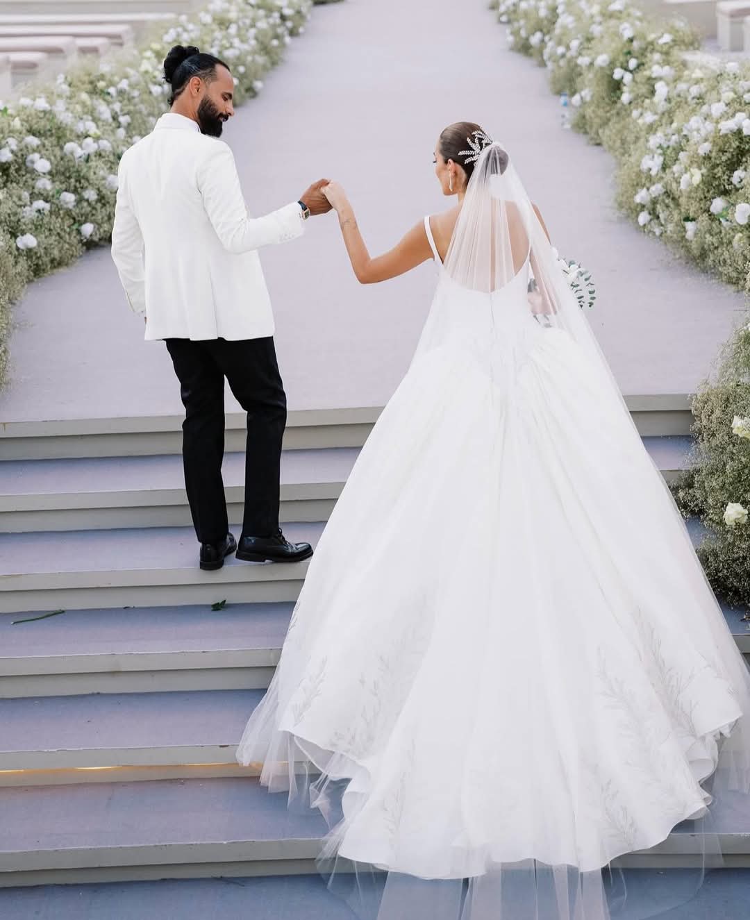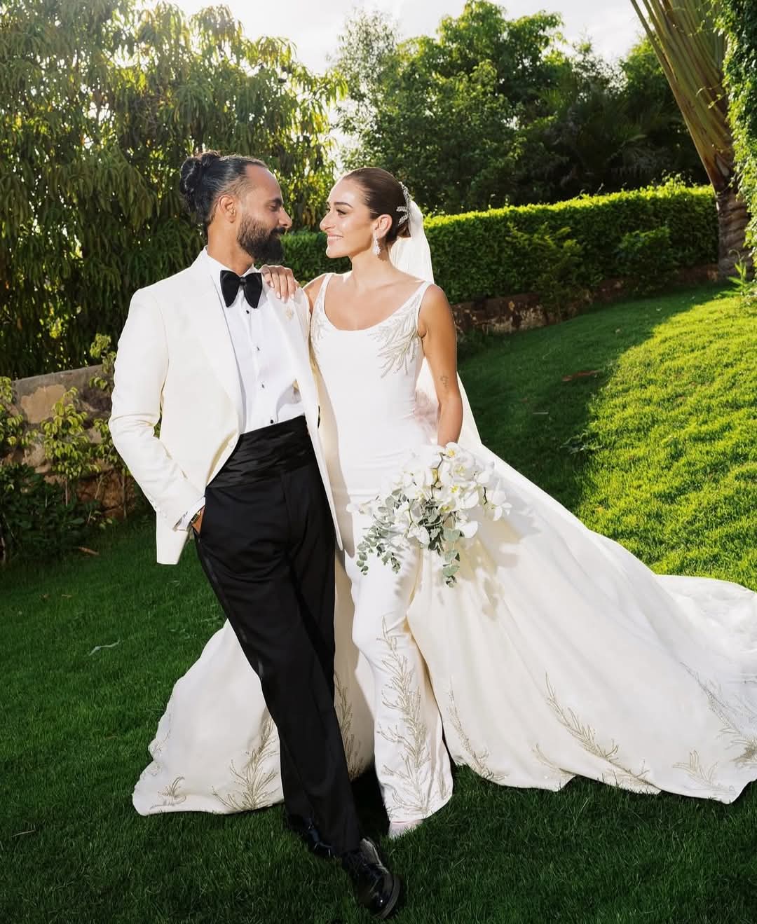 وأطلت أمينة بفستان زفاف أنيق وكذلك زوجها المصور أحمد زعتر الذي تألق ببدلة تجمع اللونين الأبيض والأسود في جلسة تصوير أولى ضمن احتفالات زفافها وسط الحدائق.