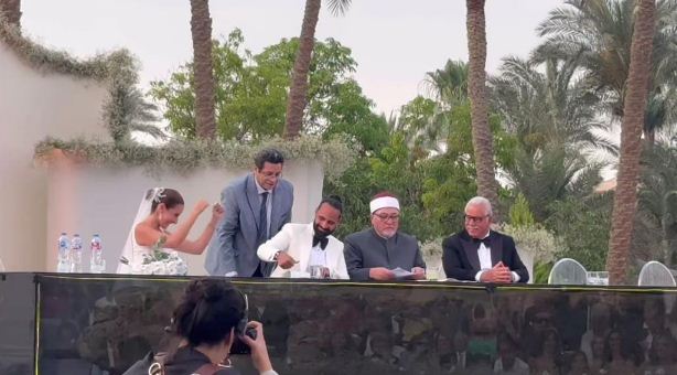 وأطلت أمينة بفستان زفاف أنيق وكذلك زوجها المصور أحمد زعتر الذي تألق ببدلة تجمع اللونين الأبيض والأسود في جلسة تصوير أولى ضمن احتفالات زفافها وسط الحدائق.