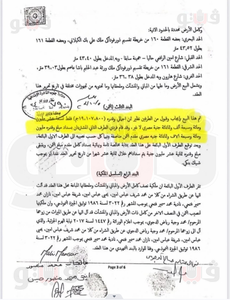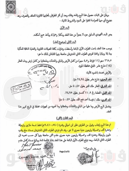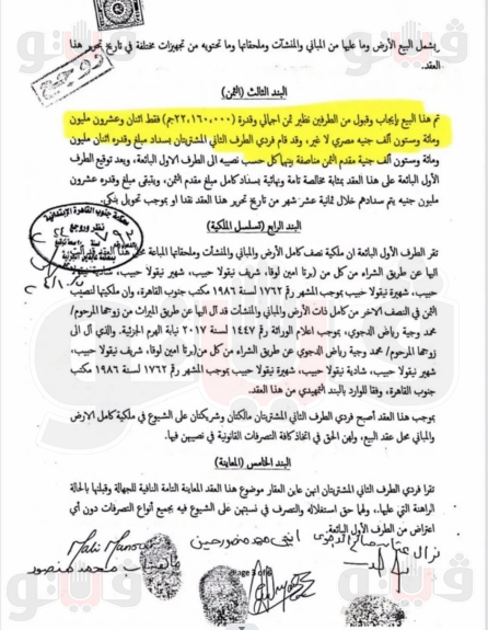 كما حررت عقدا آخر لبيع نصف عقار بمساحة 720.40 مترًا في 10 شارع عامر – الدقي، مقابل مبلغ 8,104,500 جنيه، دُفع منها 1,104,500 جنيه مقدمًا.