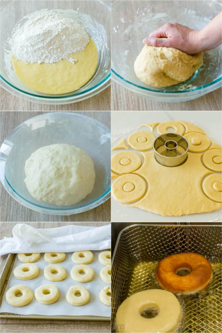 - بعد أن تختمر العجينة، أخرجها من الوعاء وافردها بلطف على سطح مرشوش بالدقيق بسُمك حوالي 1 سم. باستخدام قطاعة الدونتس أو كوب دائري وقطاعة صغيرة لعمل الفتحة الوسطى، قم بتقطيع الدونتس.