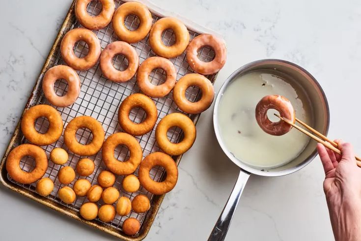 - سخّن الزيت النباتي في قدر عميق على نار متوسطة إلى متوسطة عالية. يجب أن تكون درجة حرارة الزيت حوالي 175-180 درجة مئوية. اقلي الدونتس على دفعات، 2-3 قطع في المرة الواحدة، لمدة 1-2 دقيقة لكل جانب، أو حتى يصبح لونها ذهبيًا جميلًا.