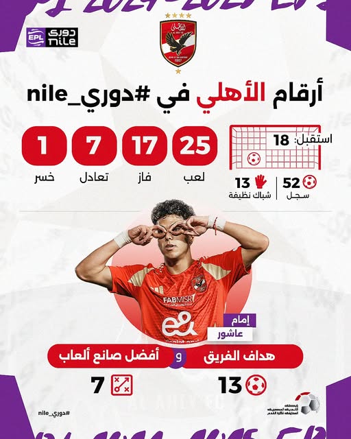 أبرزت صفحة رابطة الأندية المحترفة أرقام النادي الأهلي في موسم التتويج ببطولة الدوري المصري الممتاز موسم 2024-2025.