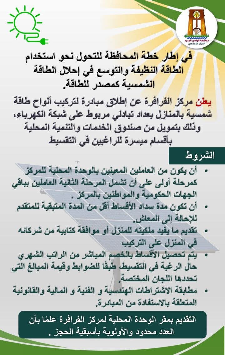مبادرة لتركيب ألواح شمسية بالمنازل بأقساط ميسرة في الفرافرة