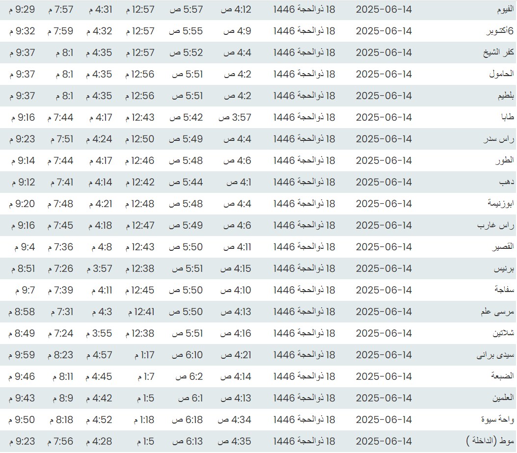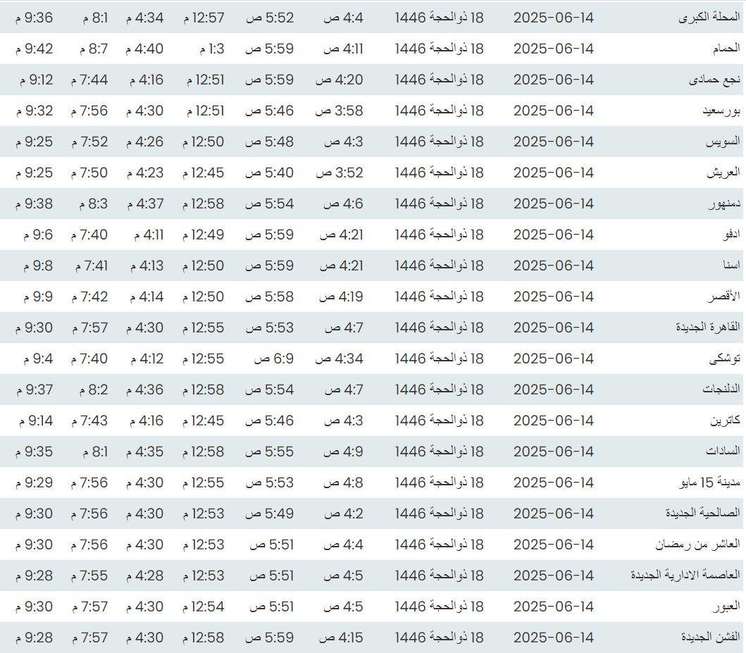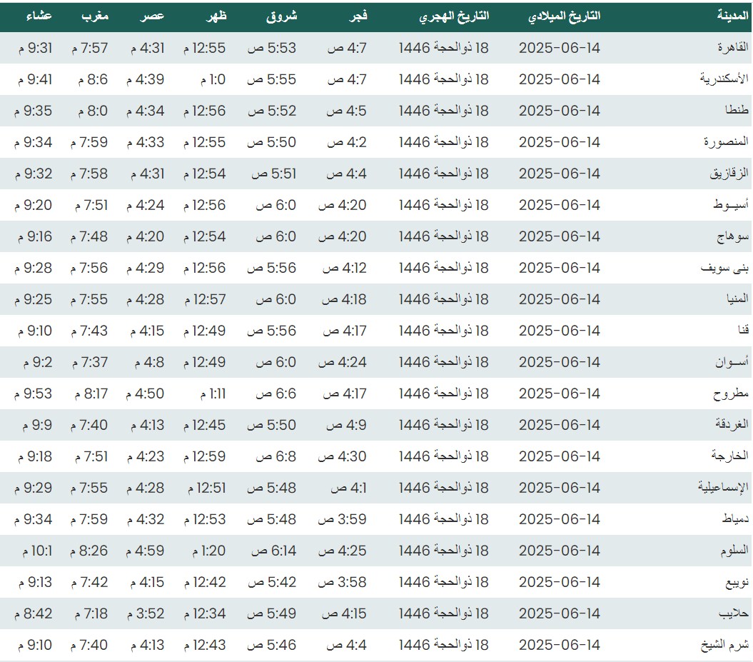 وفيما يلي مواقيت الصلاة، لعدد من مدن ومحافظات الجمهورية من واقع بيانات الهيئة العامة للمساحة