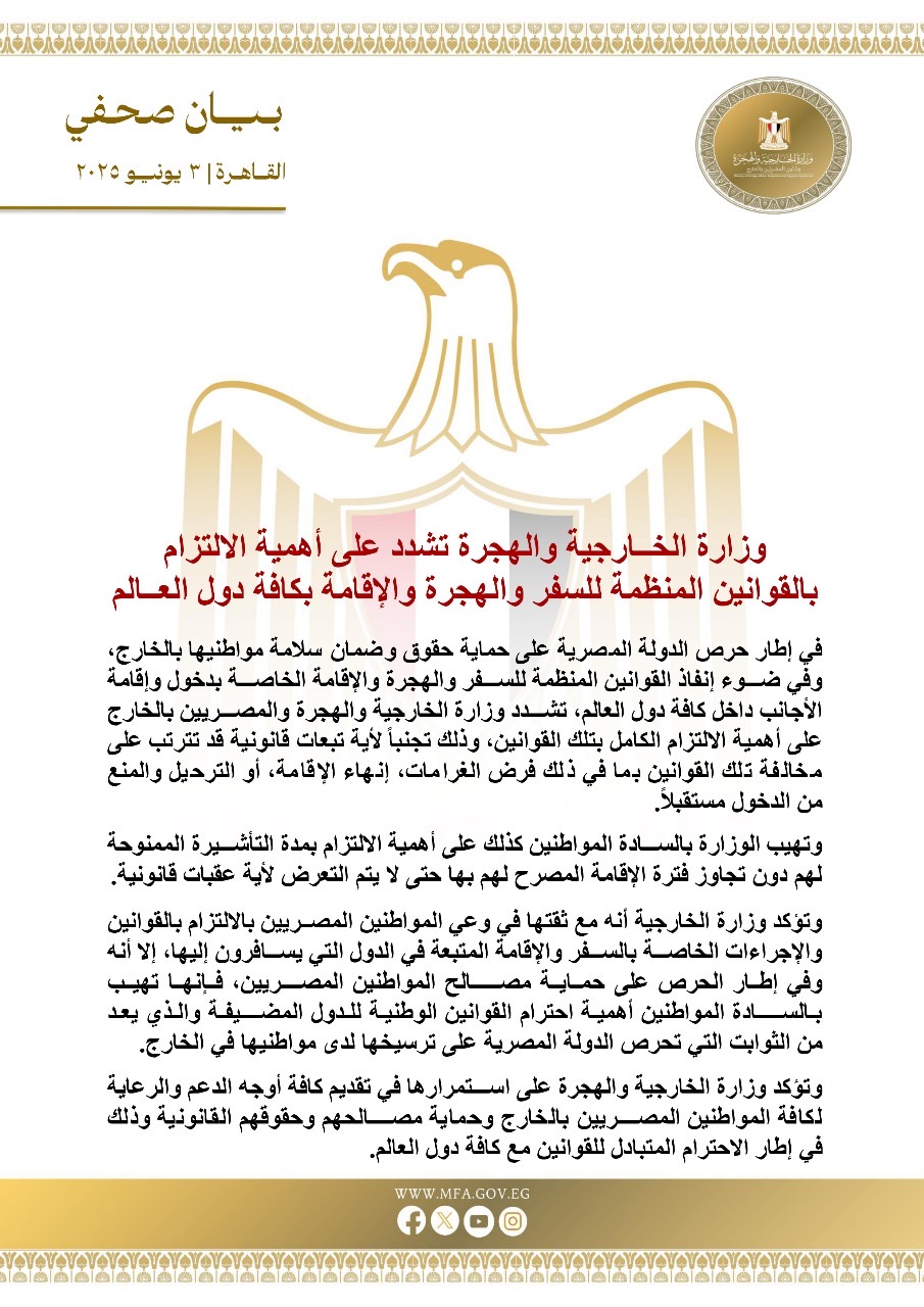 وتؤكد وزارة الخارجية أنه مع ثقتها في وعي المواطنين المصريين بالالتزام بالقوانين والإجراءات الخاصة بالسفر والإقامة المتبعة في الدول التي يسافرون إليها، إلا أنه وفي إطار الحرص على حماية مصالح المواطنين المصريين، فإنها تهيب بالسادة المواطنين أهمية احترام القوانين الوطنية للدول المضيفة والذي يعدمن الثوابت التي تحرص الدولة المصرية على ترسيخها لدى مواطنيها في الخارج.