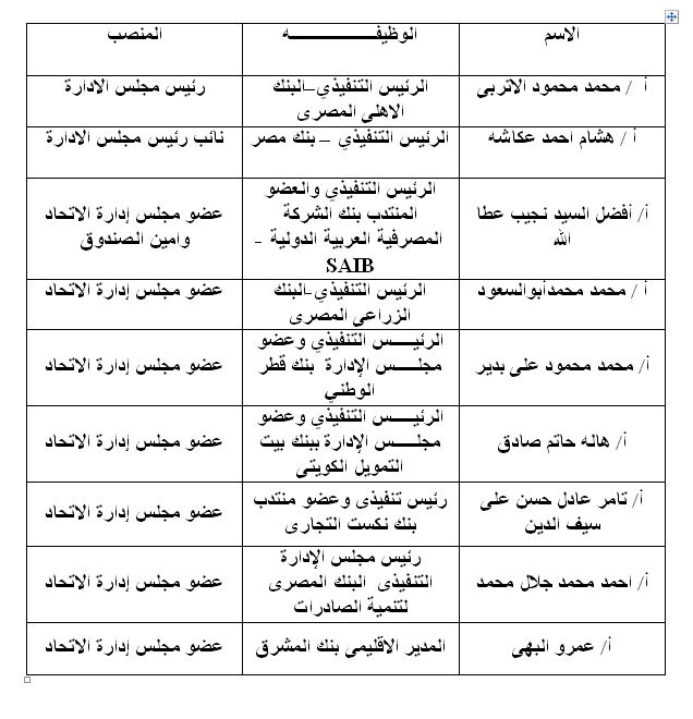ووافقت الجمعية بحضور الأغلبية المطلقة على بند انتخاب أعضاء مجلس إدارة الاتحاد ليكون مجلس إدارة الاتحاد فى تشكيله الجديد على النحو التالى:-