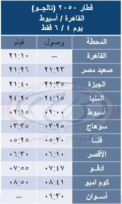 وقررت الهيئة تشغيل قطار تالجو إضافي رقم 2050 من القاهرة إلى أسوان اليوم 4 / 6 / 2025 فقط، حيث يقوم من القاهرة الساعة 21:10 ويصل أسوان الساعة 9:30 صباح اليوم التالي كالجدول المرفق.