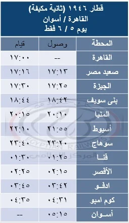 كما قررت الهيئة تبكير جدول القطار المخصوص رقم 1946 (ثانية مكيفة) القاهرة / أسوان يوم 5 / 6 / 2025 فقط (وقفة عيد الأضحى المبارك) حتى يتمكن جمهور الركاب من الوصول إلى الوجه القبلي قبل صلاة عيد الأضحى المبارك، حيث يقوم من القاهرة الساعة 17:00 ويصل أسوان الساعة 5:15 طبقًا للجدول المرفق.