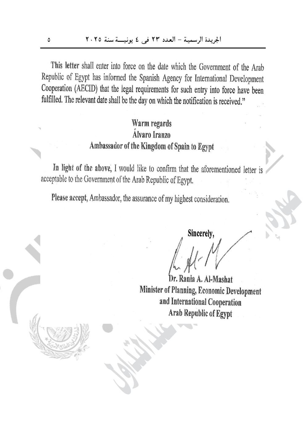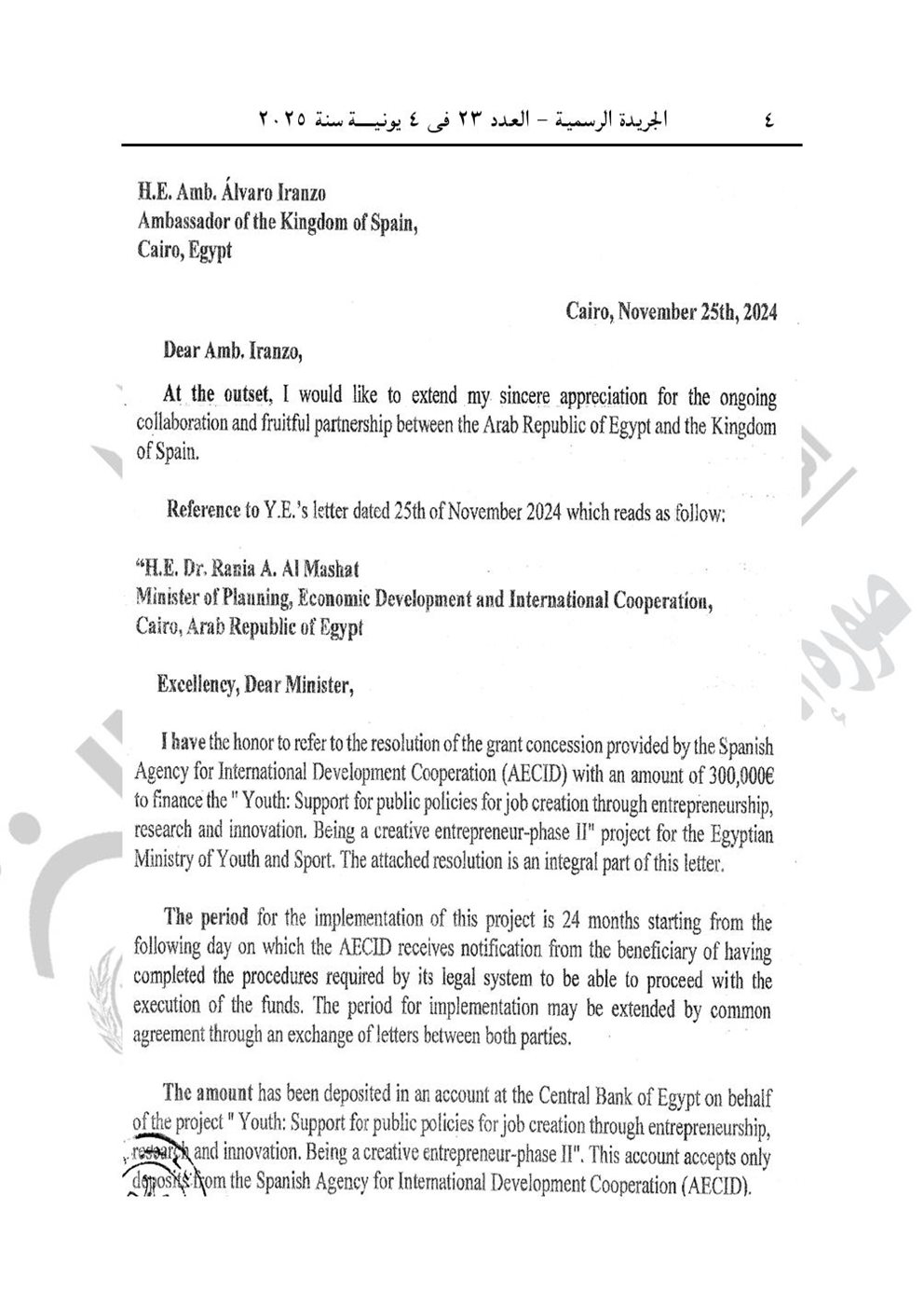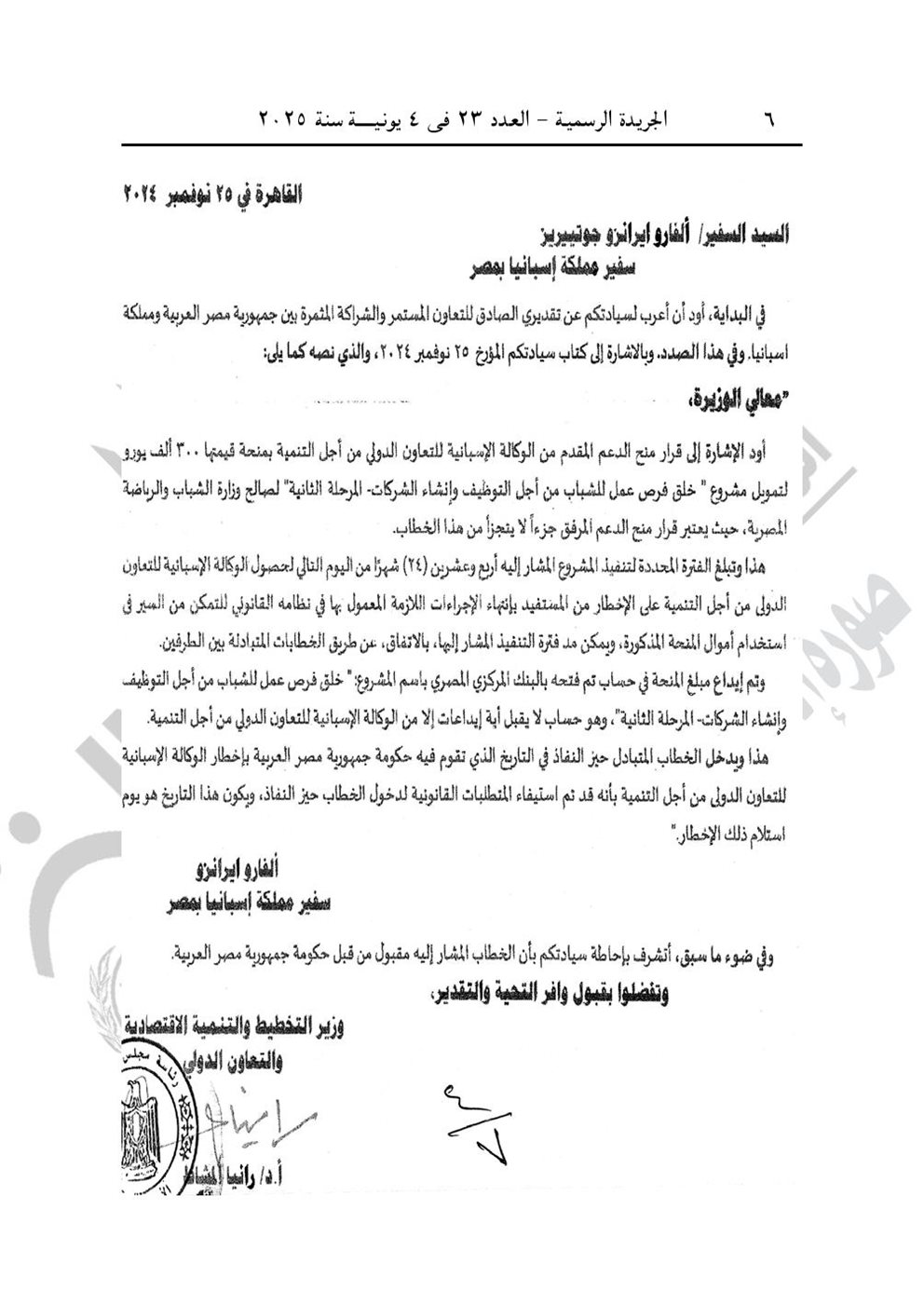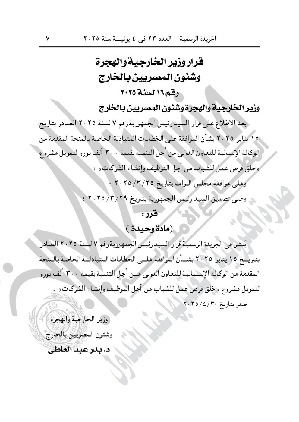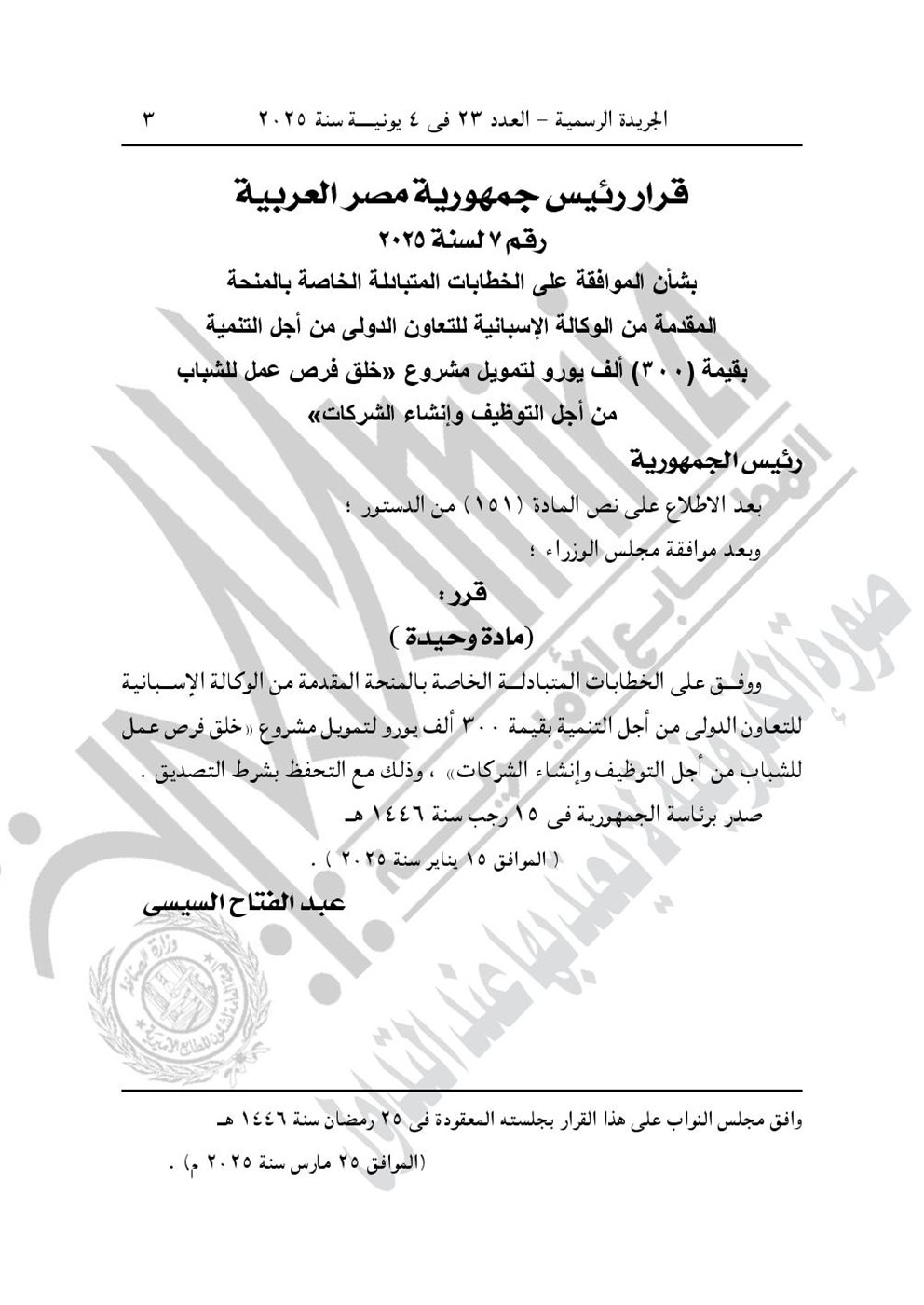 -القرار الجمهوري الجديد رقم 7 لسنة 2025، بشأن الموافقة على الخطابات المتبادلة الخاصة بالمنحة المقدمة من الوكالة الإسبانية للتعاون الدولى من أجل التنمية بقيمة (300) ألف يورو لتمويل مشروع "خلق فرص عمل للشباب من أجل التوظيف وإنشاء الشركات"، وذلك مع التحفظ بشرط التصديق.