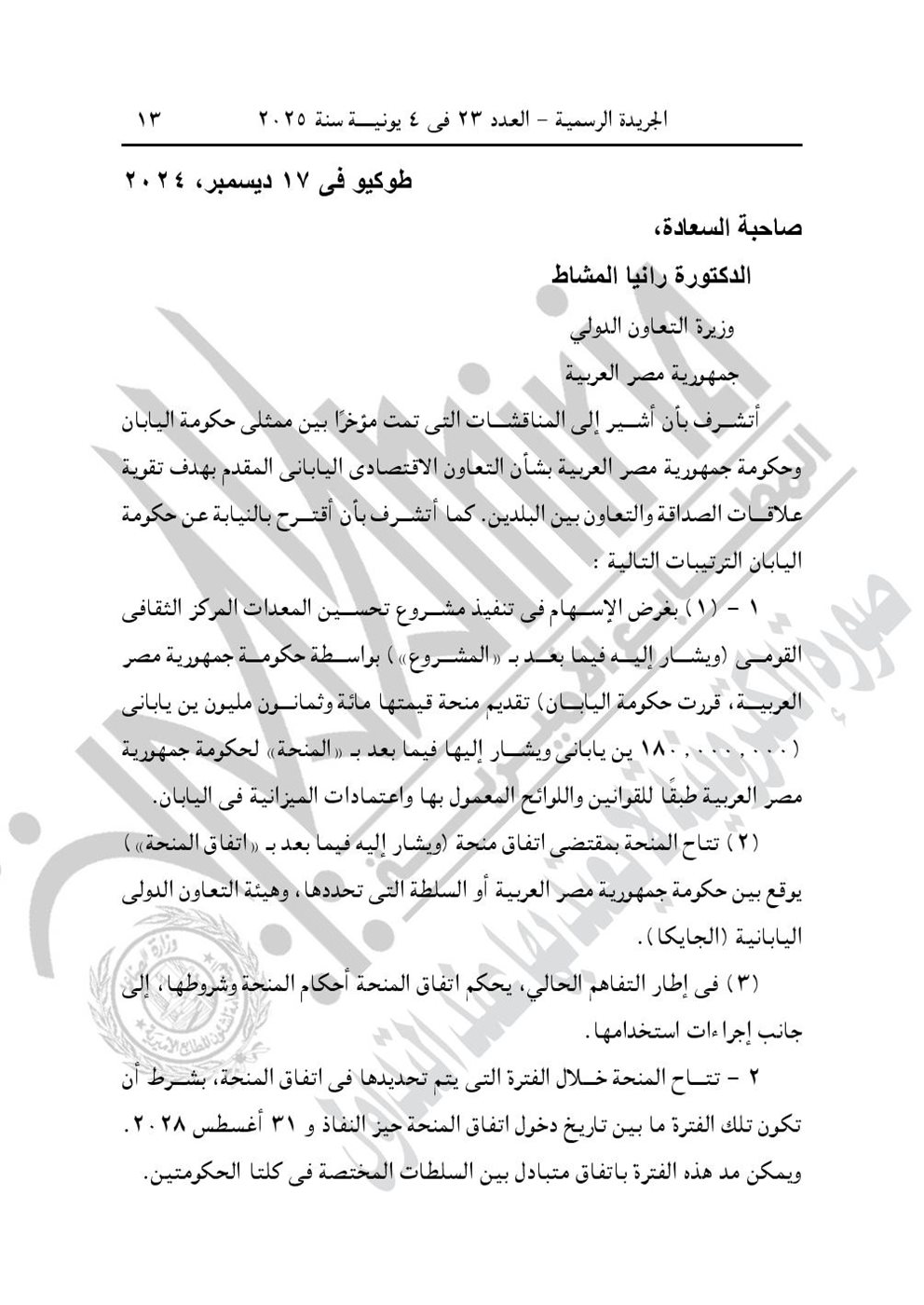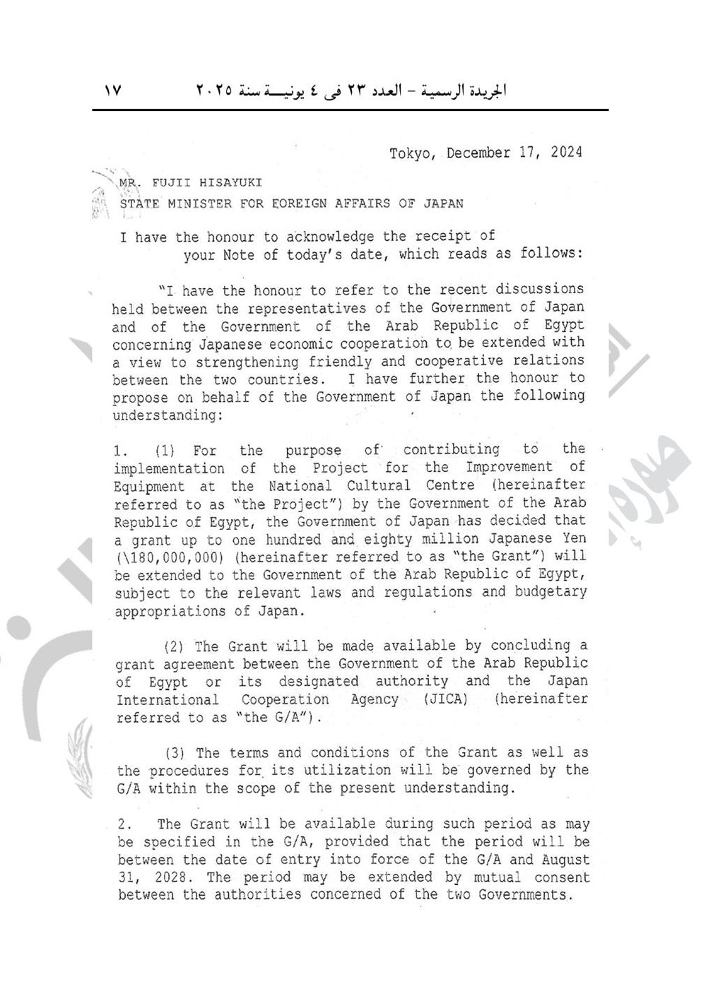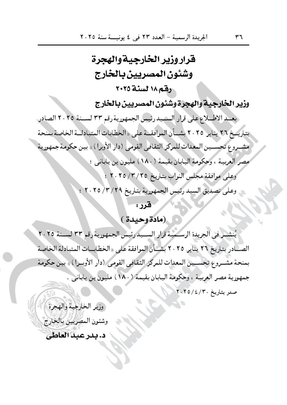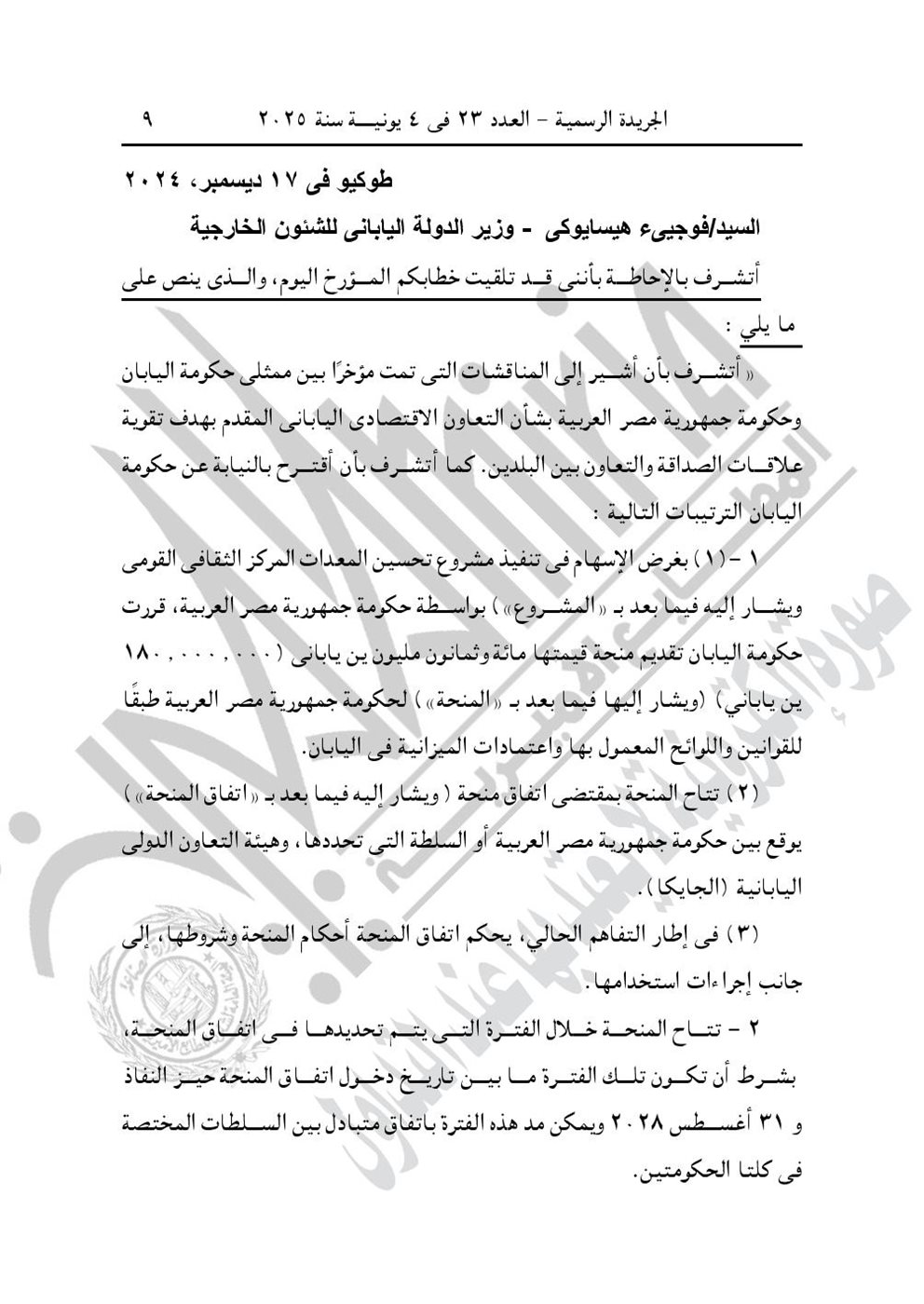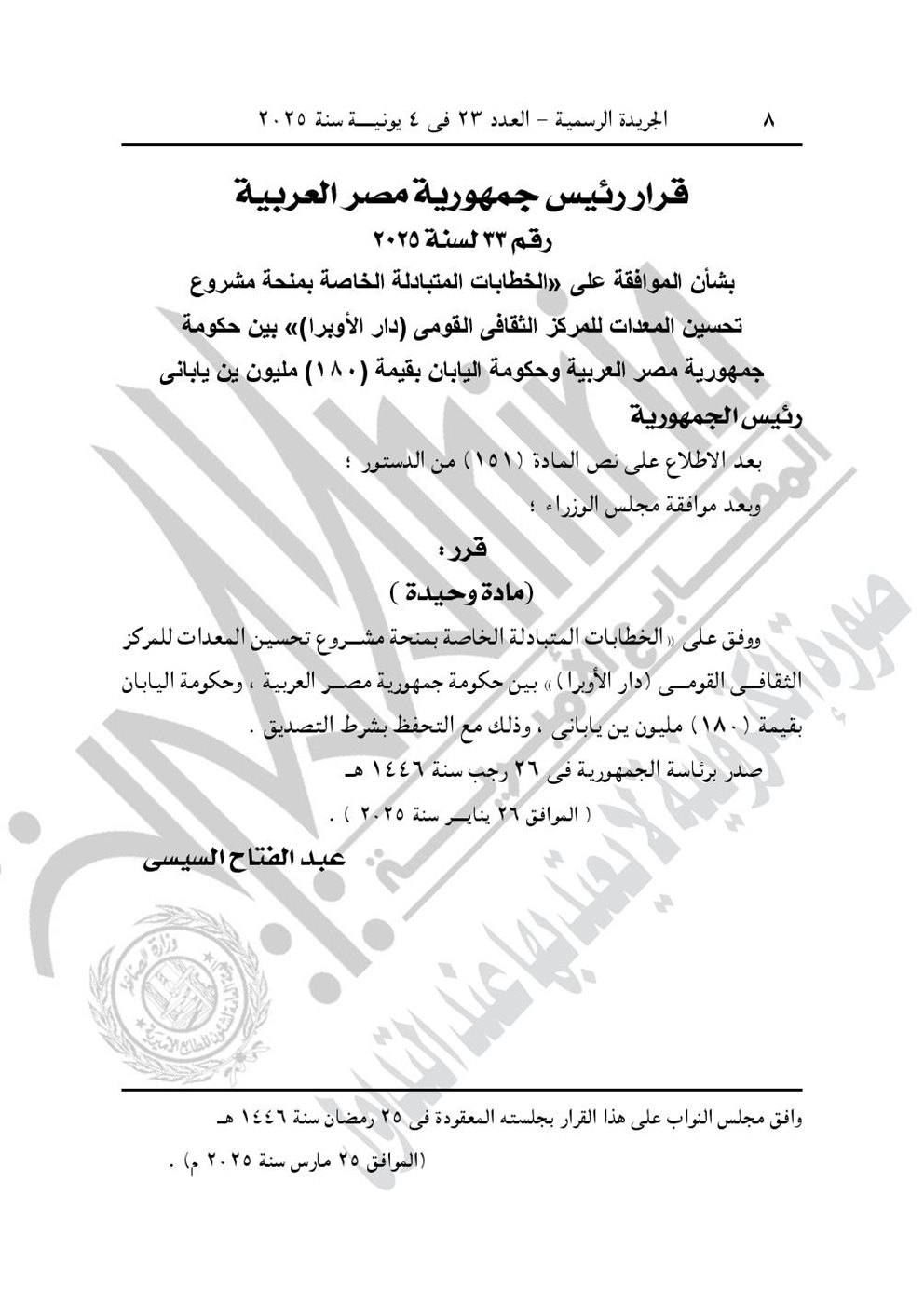- قرار رئيس الجمهورية رقم 33 لسنة 2025، بشأن الموافقة على "الخطابات المتبادلة الخاصة بمنحة مشروع تحسين المعدات للمركز الثقافى القومى (دار الأوبرا)" بين حكومة جمهورية مصر العربية وحكومة اليابان بقيمة (180) مليون ين يابانى، وذلك مع التحفظ بشرط التصديق.