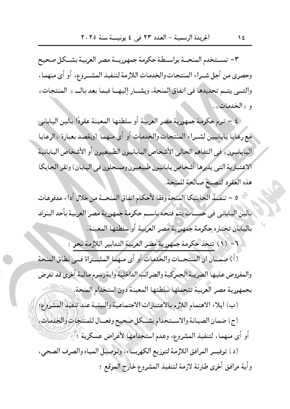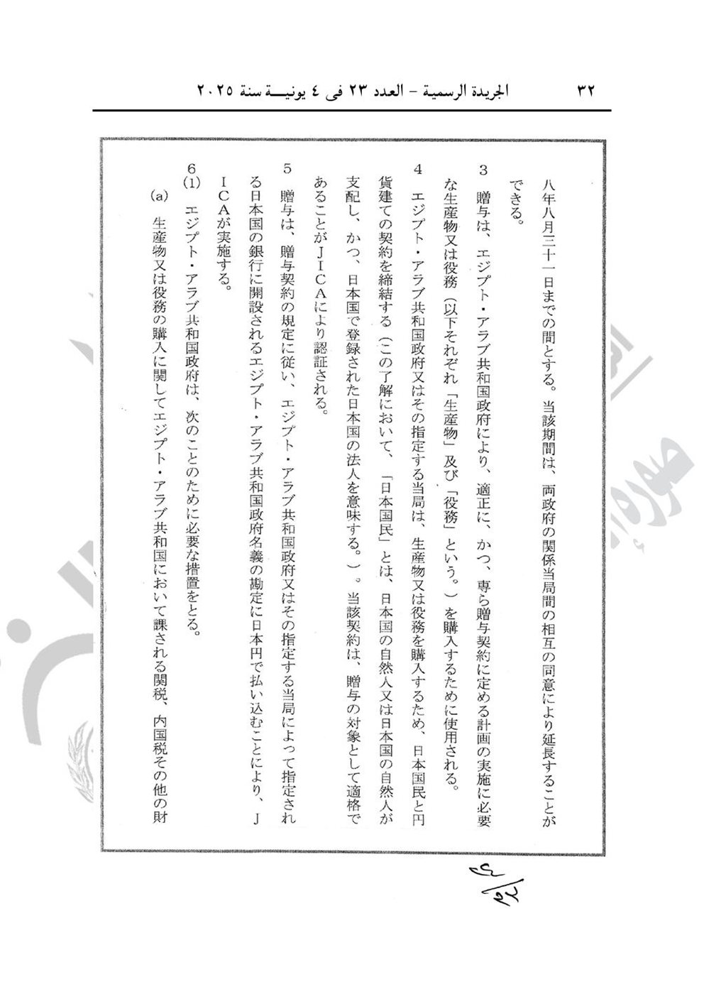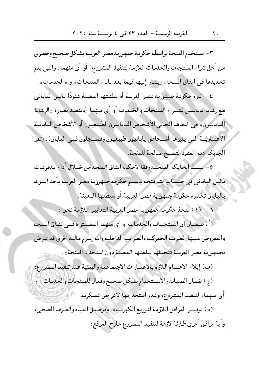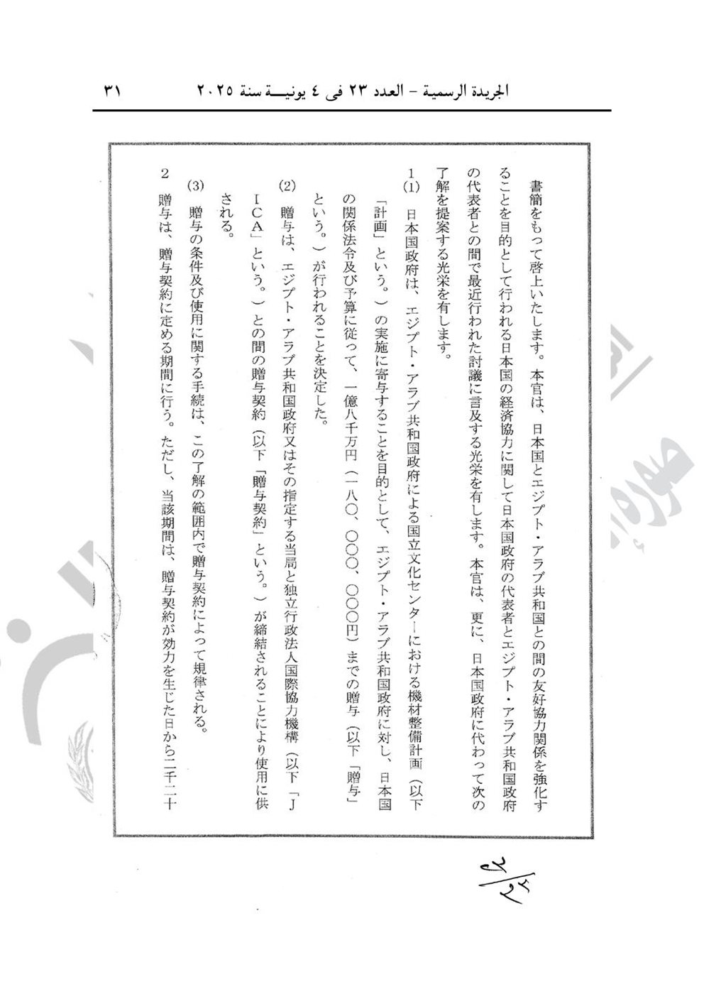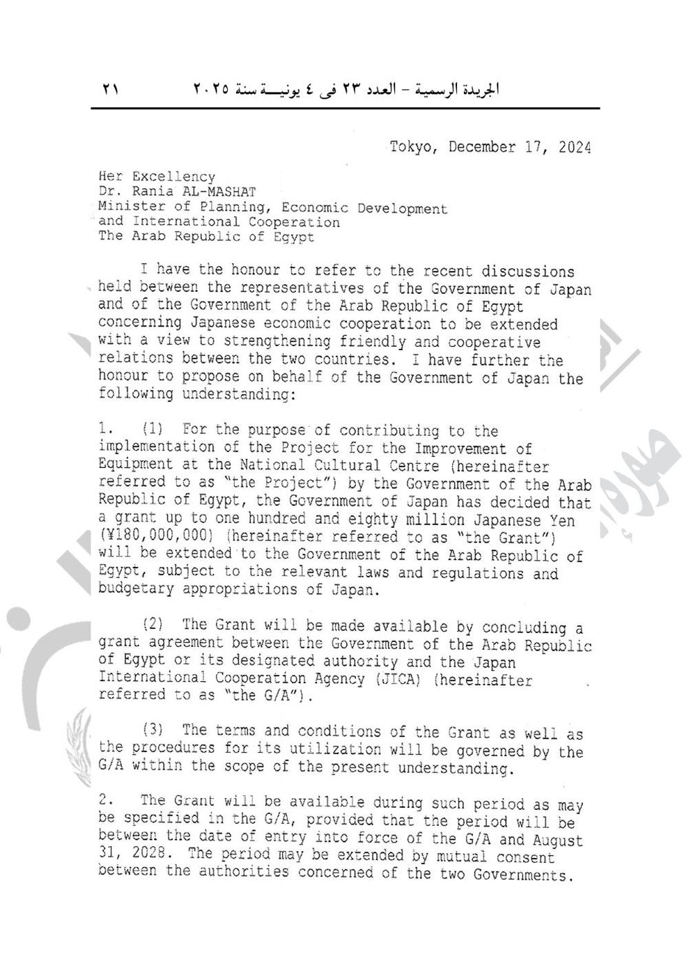 - قرار رئيس الجمهورية رقم 33 لسنة 2025، بشأن الموافقة على "الخطابات المتبادلة الخاصة بمنحة مشروع تحسين المعدات للمركز الثقافى القومى (دار الأوبرا)" بين حكومة جمهورية مصر العربية وحكومة اليابان بقيمة (180) مليون ين يابانى، وذلك مع التحفظ بشرط التصديق.