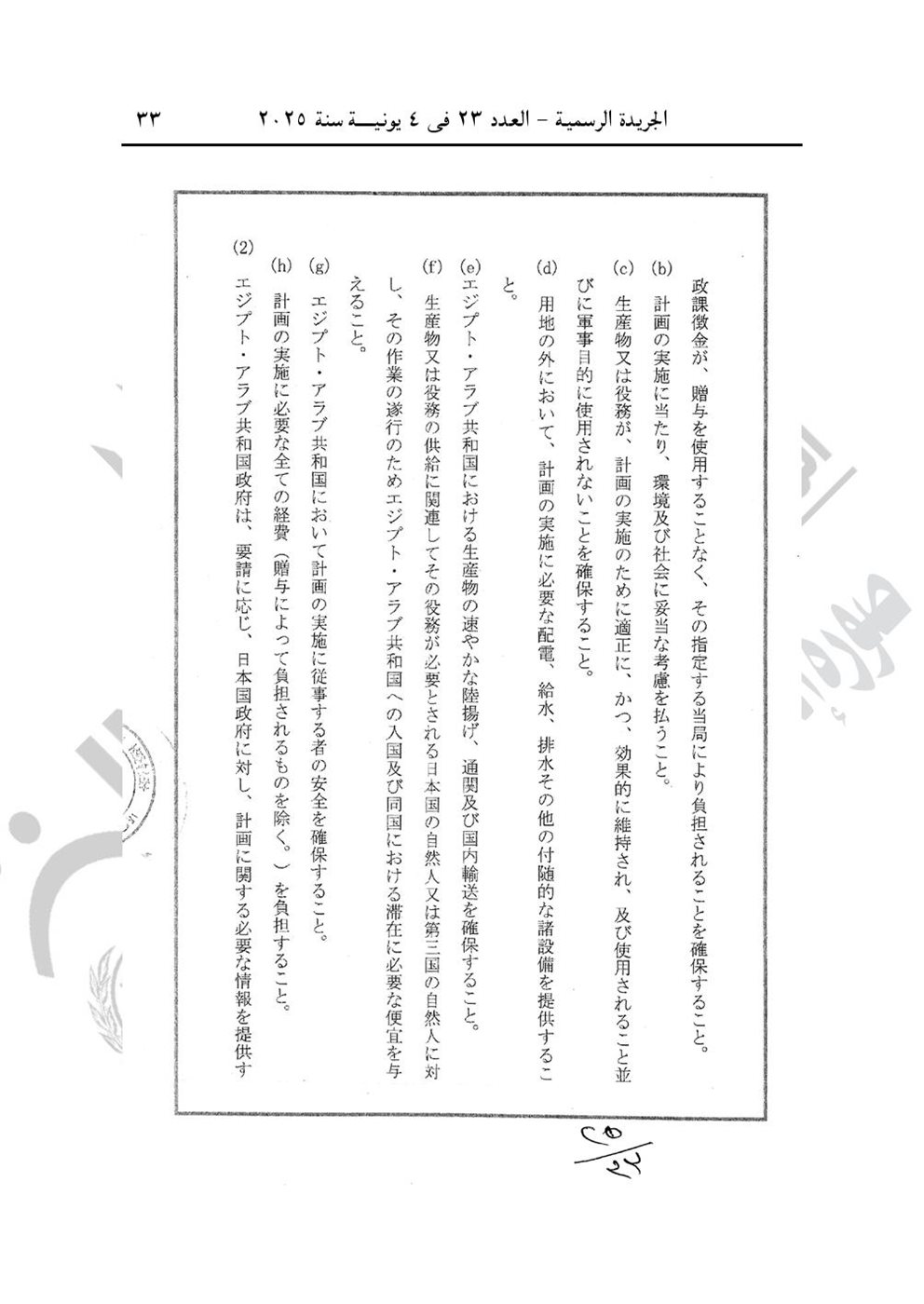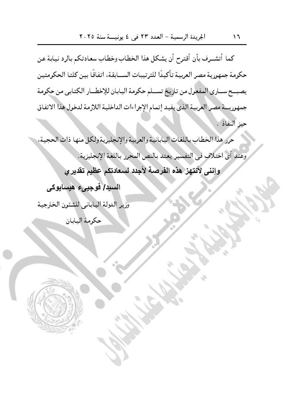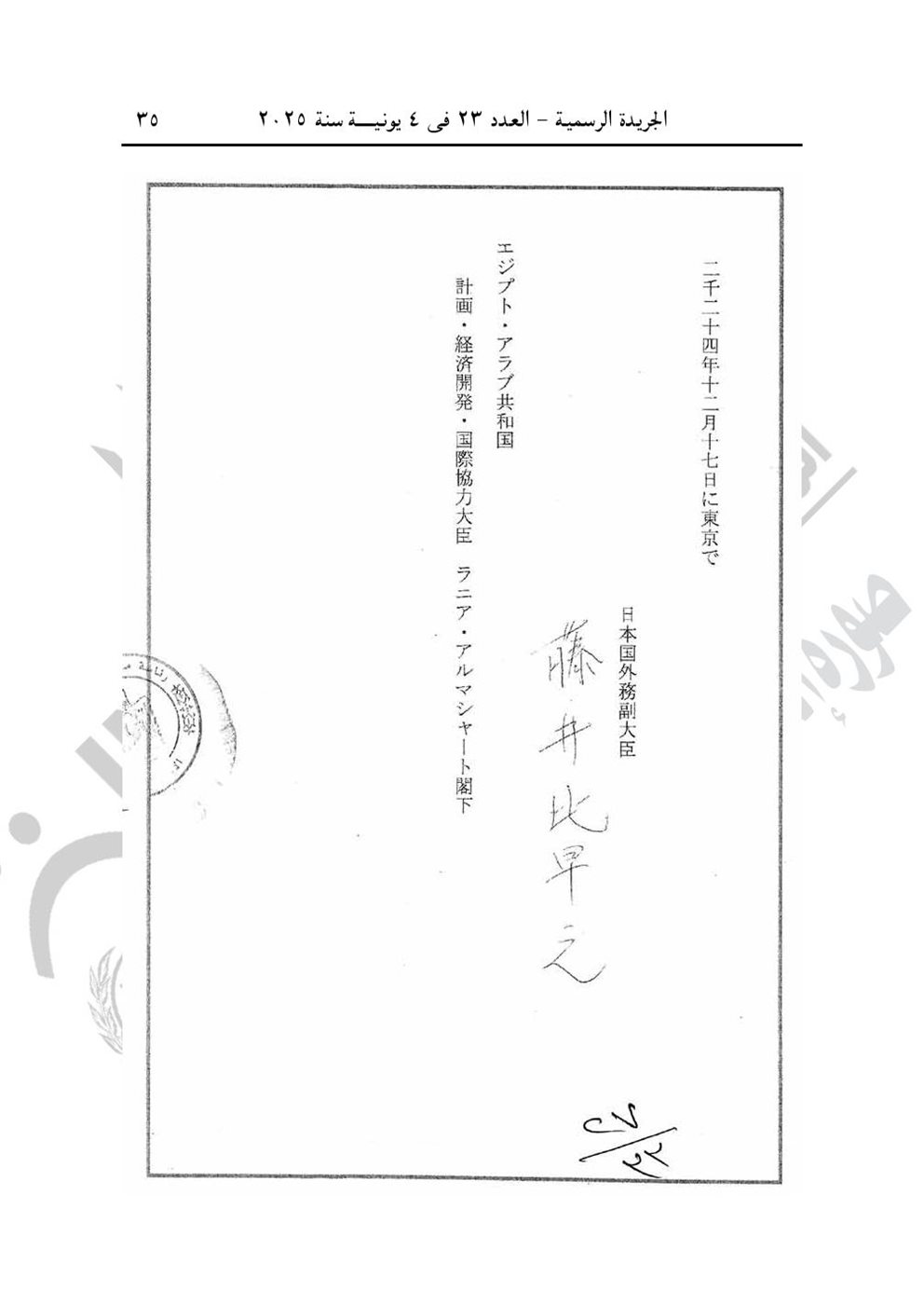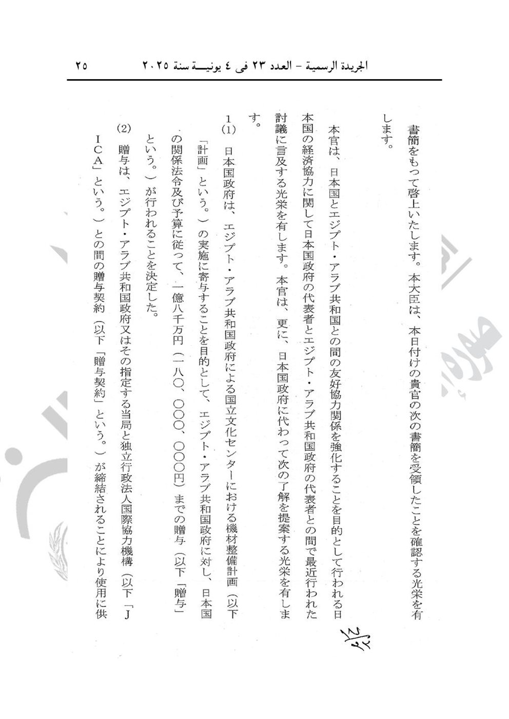 - قرار رئيس الجمهورية رقم 33 لسنة 2025، بشأن الموافقة على "الخطابات المتبادلة الخاصة بمنحة مشروع تحسين المعدات للمركز الثقافى القومى (دار الأوبرا)" بين حكومة جمهورية مصر العربية وحكومة اليابان بقيمة (180) مليون ين يابانى، وذلك مع التحفظ بشرط التصديق.